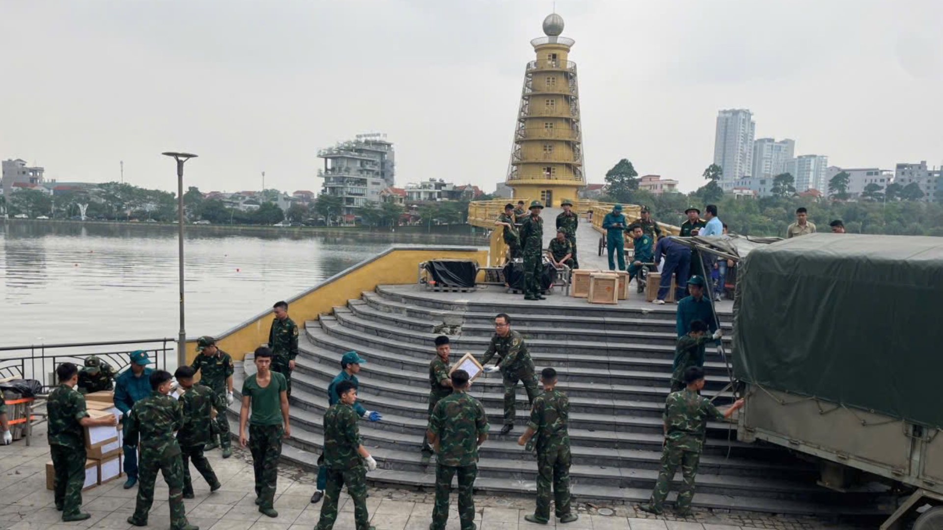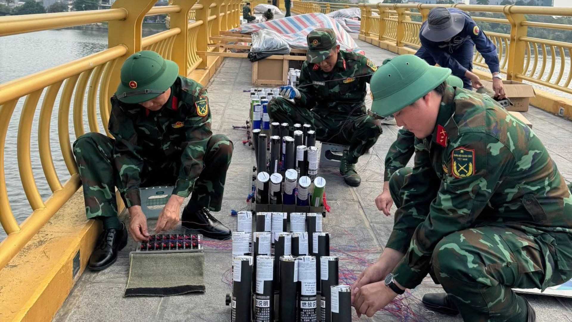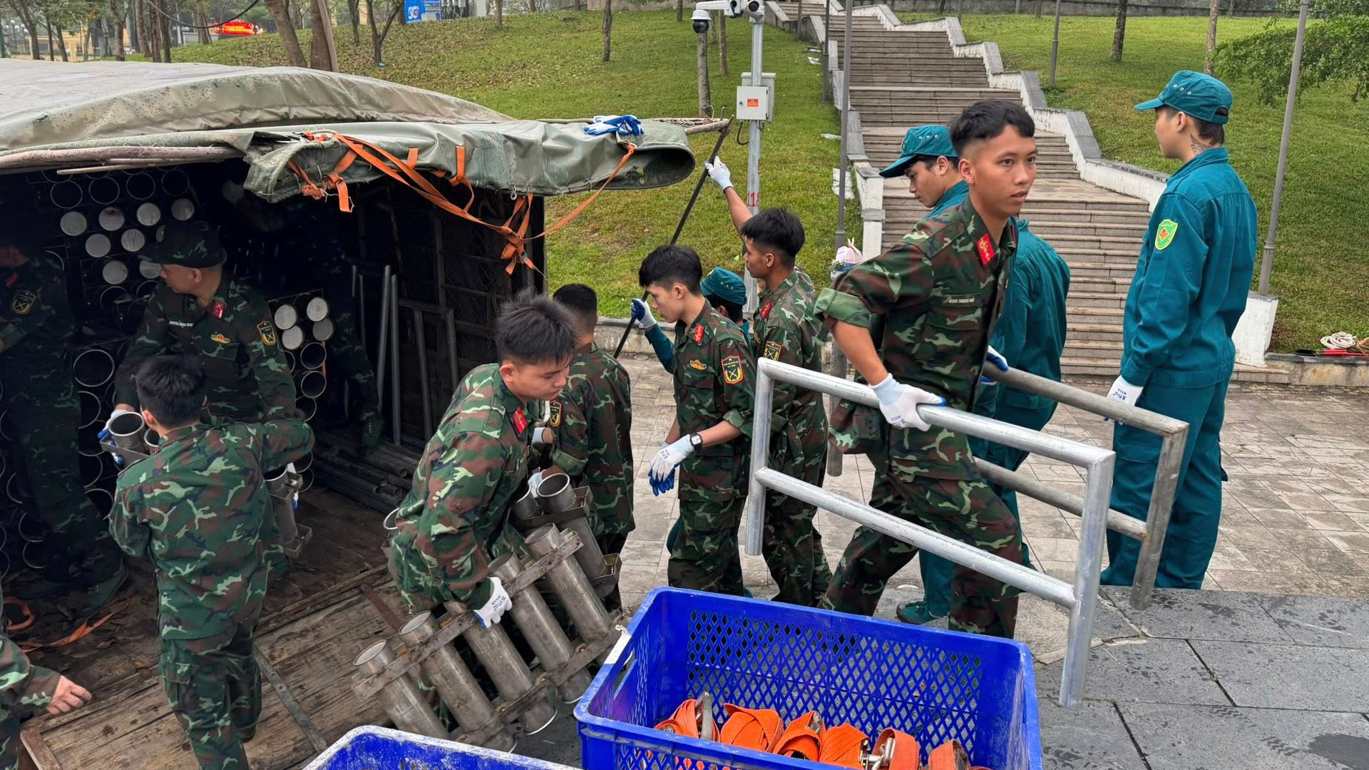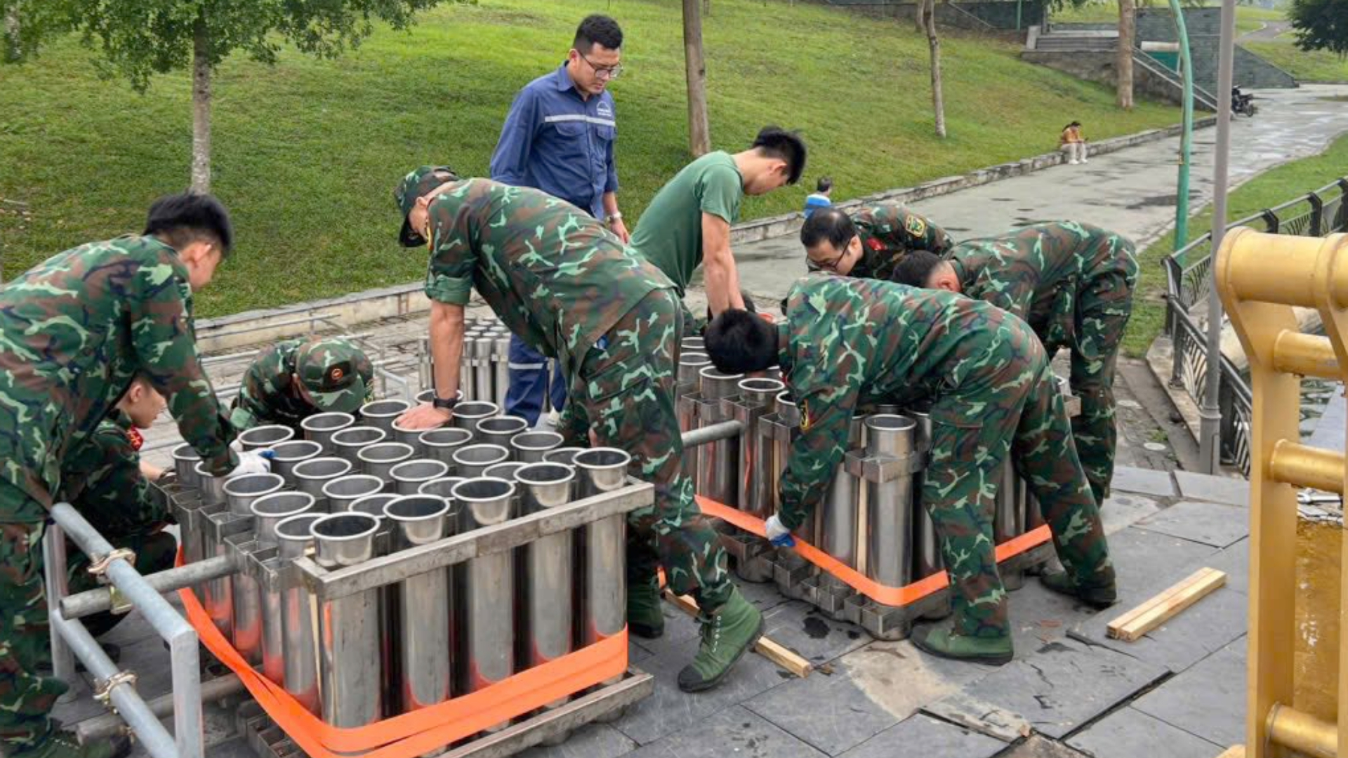 Công tác vận chuyển pháo, tổ chức tiếp nhận, bảo quản và đấu nối hệ thống kỹ thuật tại khu vực Cầu Vàng - Công viên Văn Lang được thực hiện một cách cẩn thận, chính xác, bảo đảm an toàn.