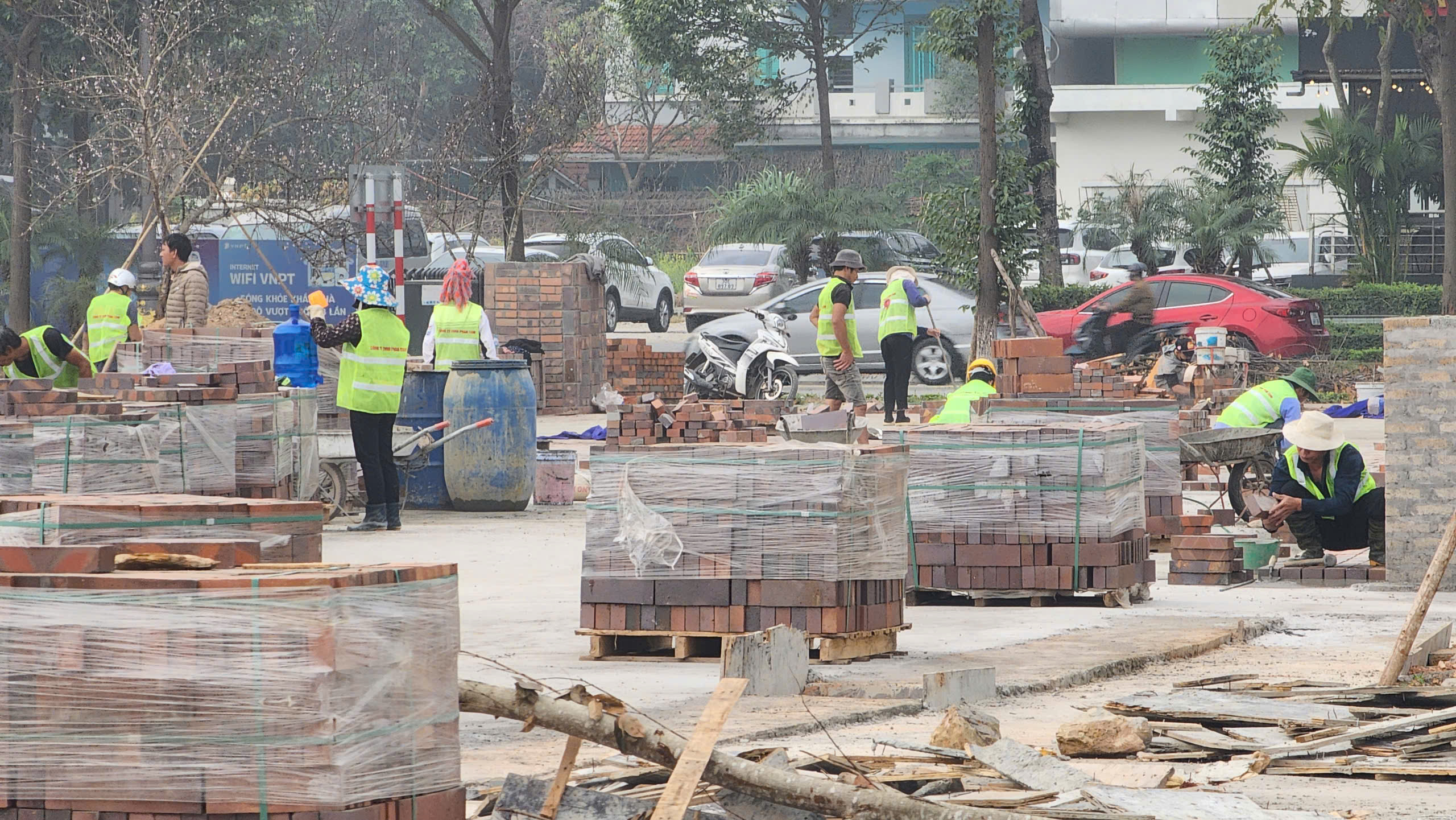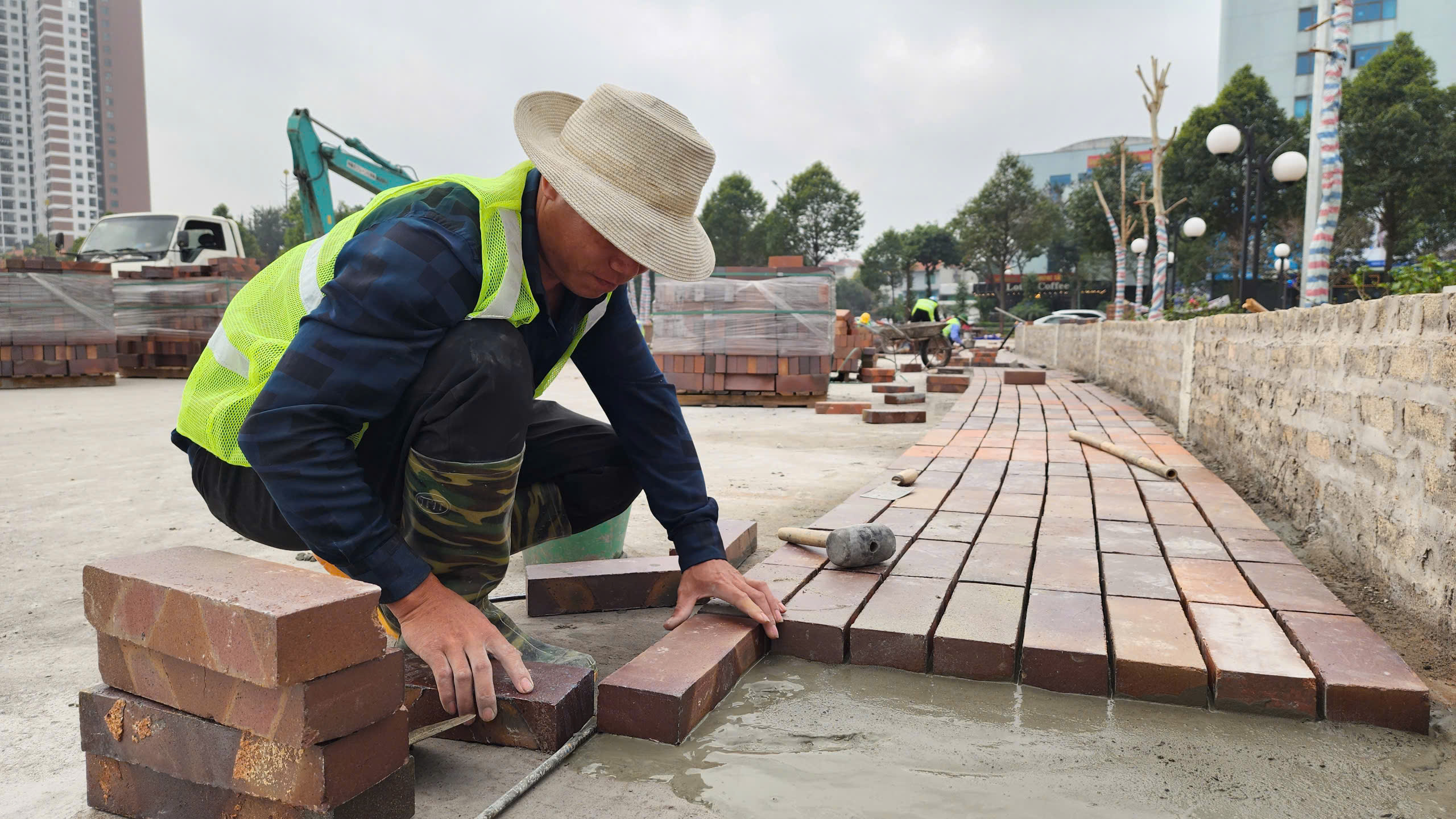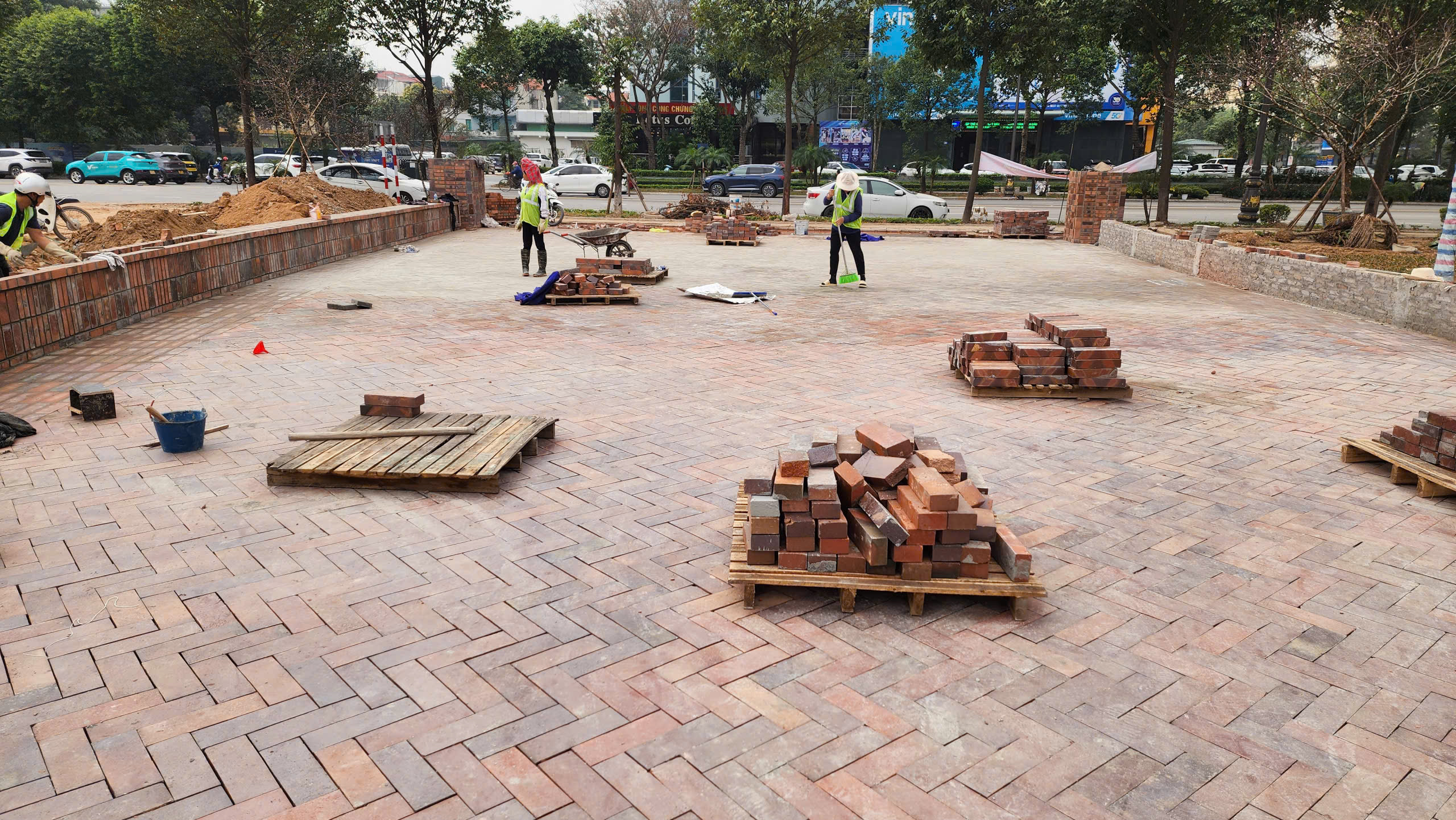 Hàng chục công nhân đang miệt mài lát những viên gạch gốm để hoàn thành con đường gốm dài 300m, rộng 10m chạy ngang qua công viên Văn Miếu.
