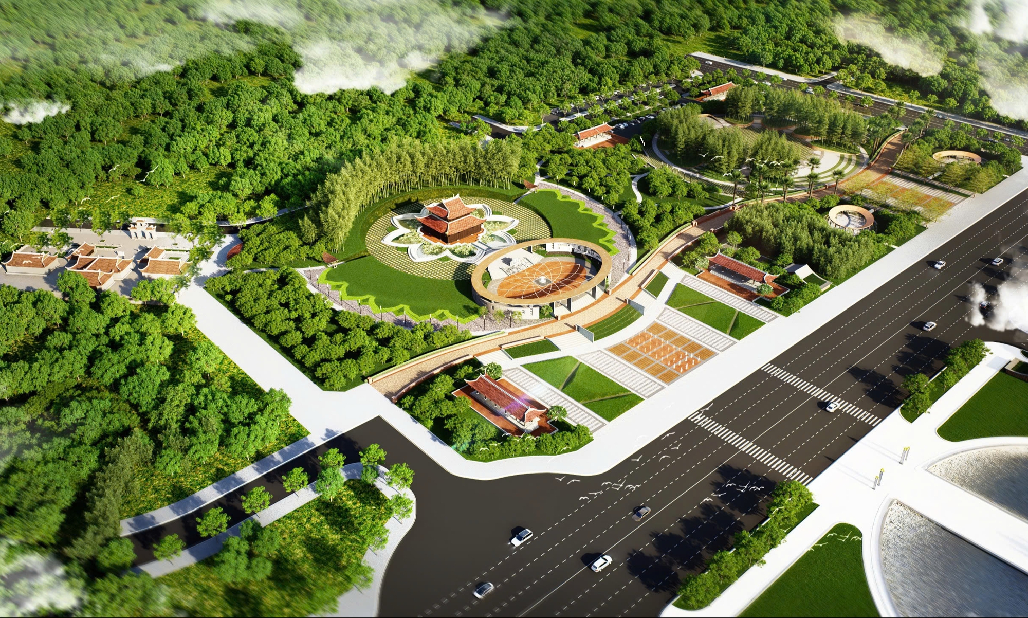Điểm nhấn của dự án là đền thờ Bác Hồ được thiết kế quy mô 2 tầng, 8 mái, cấu trúc gỗ truyền thống, diện tích 182m², sân đền đặt trên một hồ sen rộng 1.100m².