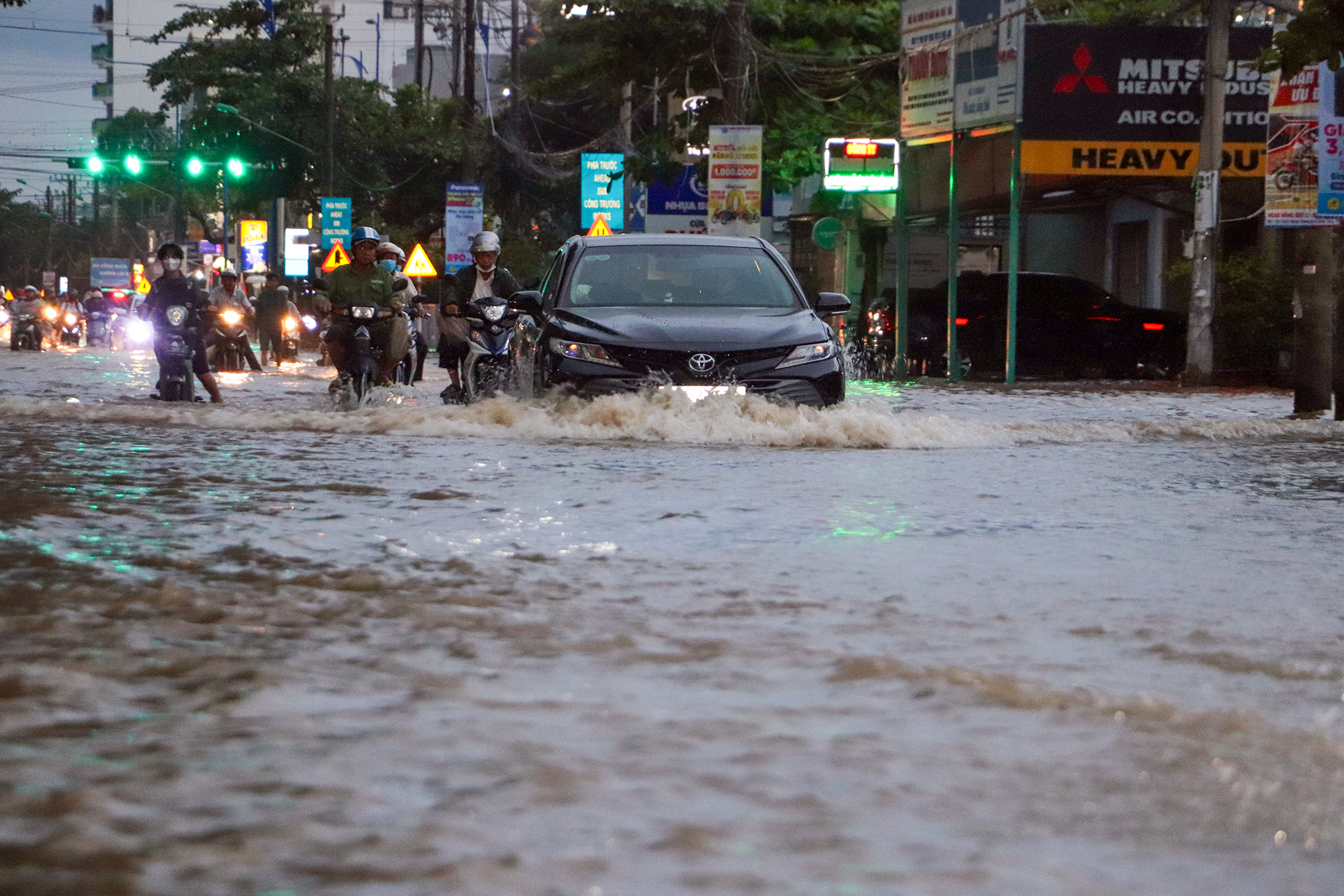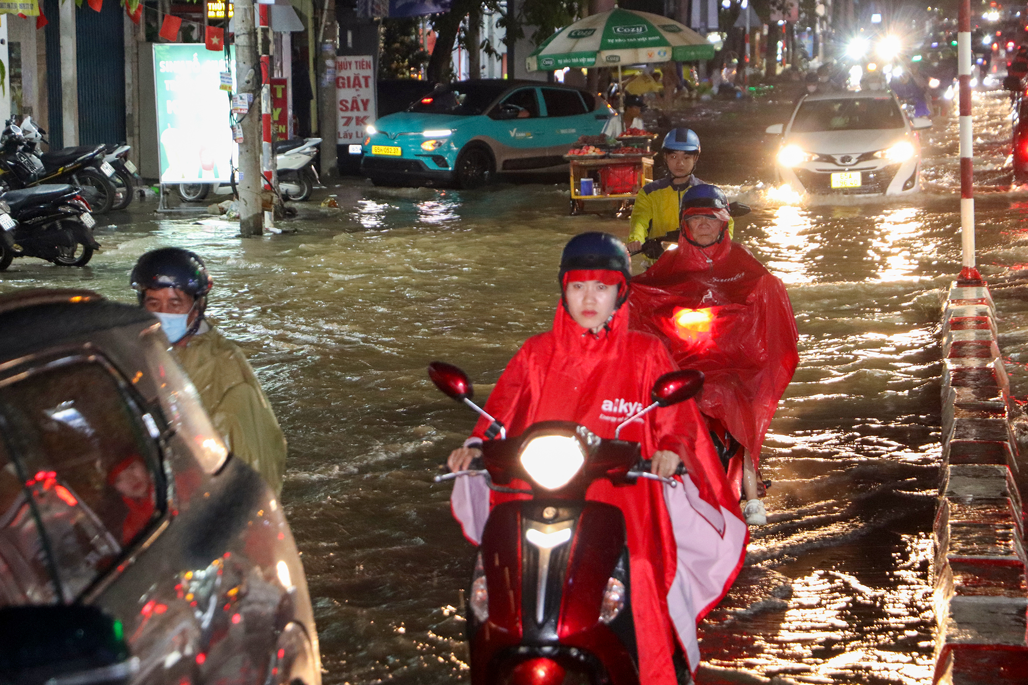 Hầu hết, các phương tiện, nhất là xe máy di chuyển ra giữa làn đường cố gắng tránh khu vực ngập sâu. Dòng phương tiện di chuyển chậm chạp.