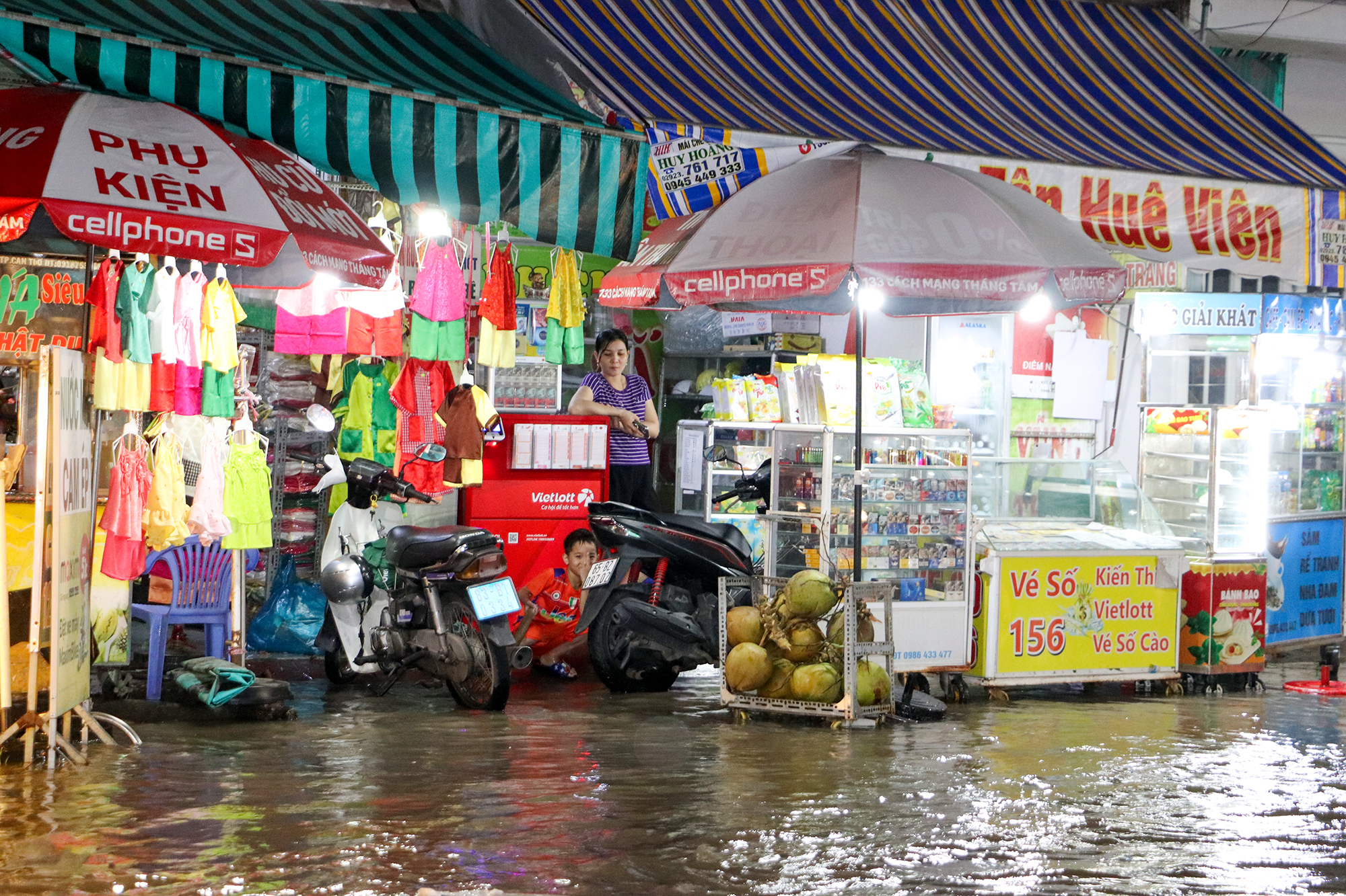 Triều cường lên cao kèm mưa làm cho việc đi lại của người dân càng vất vả hơn.
