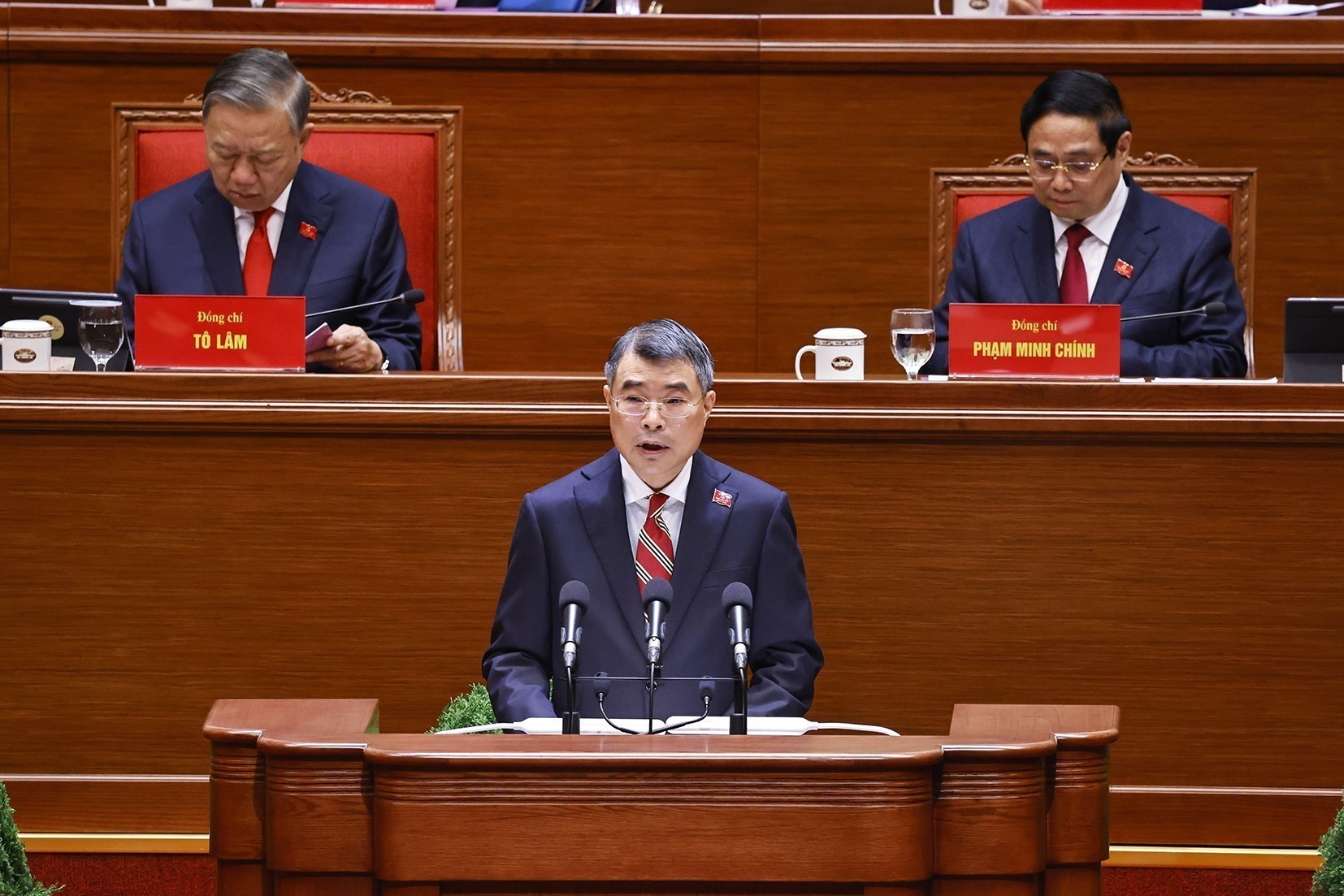 Ông Lê Minh Hưng, Trưởng Ban Tổ chức Trung ương thay mặt đoàn Chủ tịch trình bày báo cáo của Ban chấp hành Trung ương Đảng khóa 13 về công tác nhân sự Ban chấp hành Trung ương Đảng khóa 14. Ảnh: TTXVN