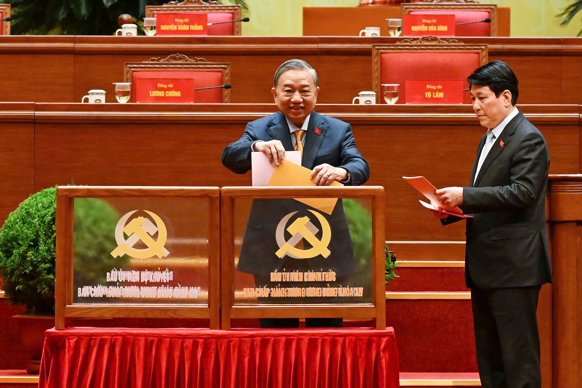 Tổng Bí thư Tô Lâm và Chủ tịch nước Lương Cường bỏ phiếu bầu các ủy viên Trung ương chính thức và các ủy viên dự khuyết Ban chấp hành Trung ương Đảng khóa 14. Ảnh: TTXVN