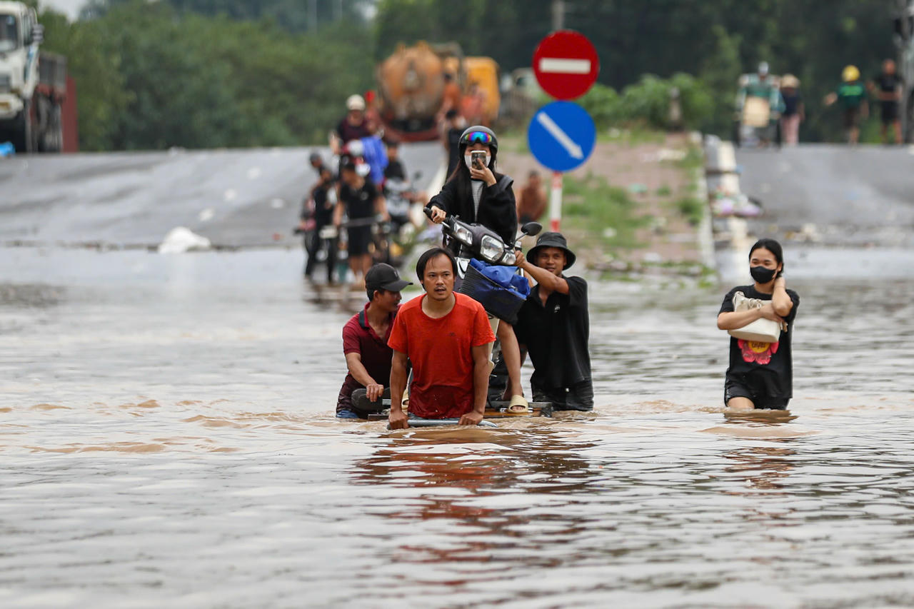 Do ngập úng sâu, các phương tiện không thể di chuyển vào đường gom Đại lộ Thăng Long.