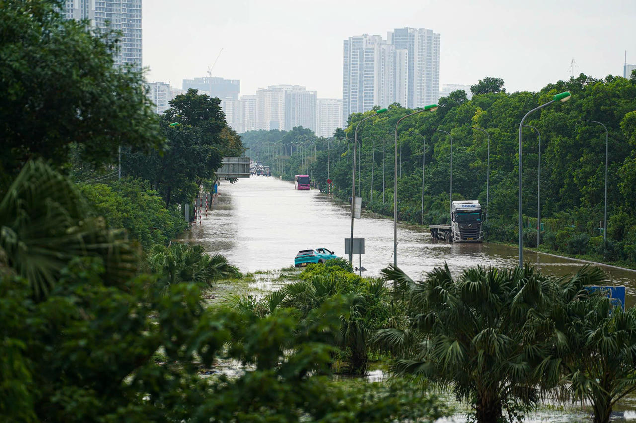 Mặt đường Đại lộ Thăng Long bỗng trở 'thành sông' sau 2 ngày mưa lớn kéo dài.