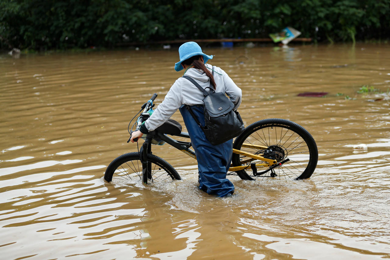 Người dân vất vả dắt xe qua vùng nước ngập.
