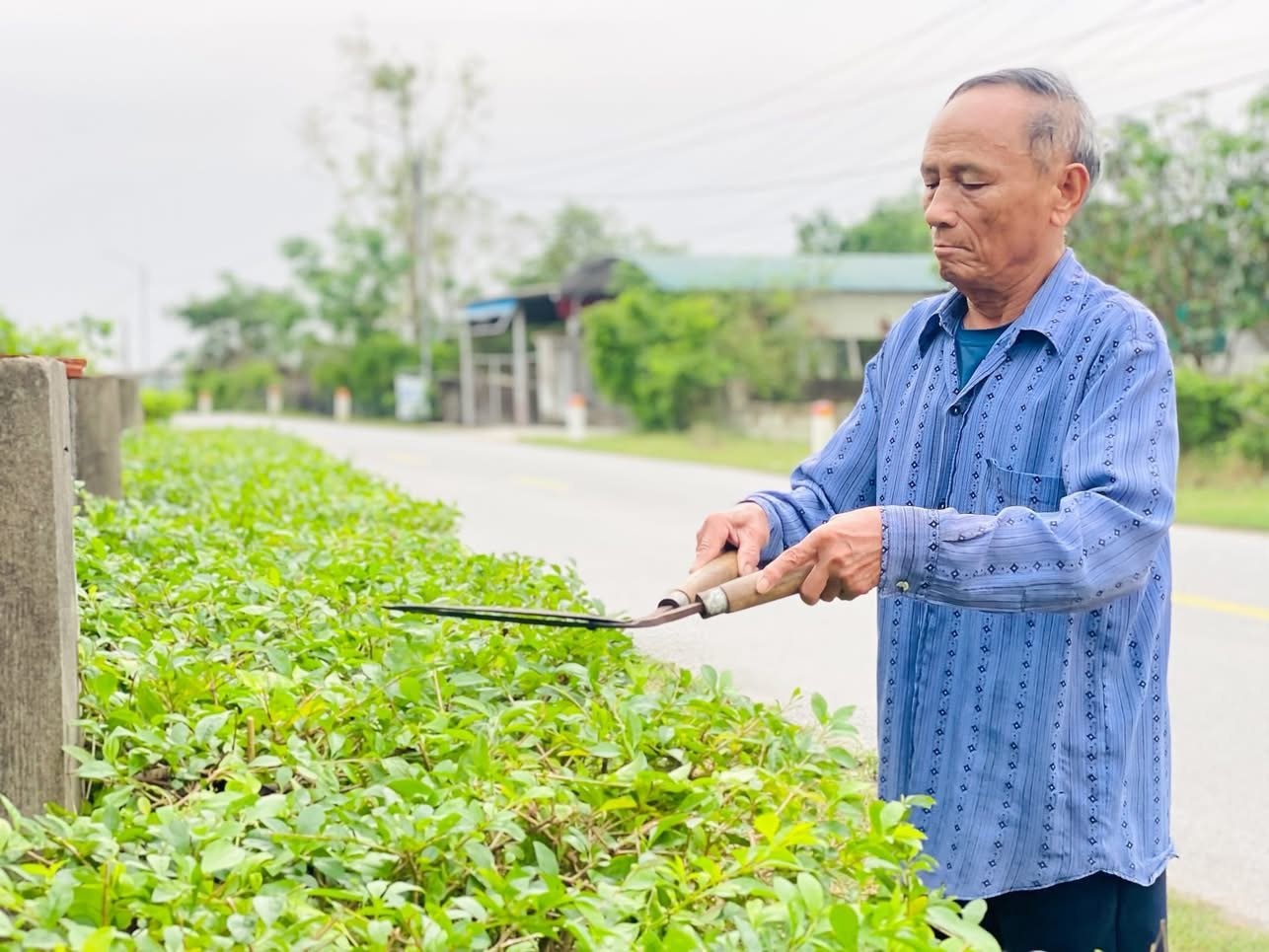 Trên đường đi tác nghiệp tại thôn Liên Hải (Thạch Khê, Hà Tĩnh), ống kính của phóng viên đã ghi nhận một hình ảnh giản dị nhưng đong đầy ý nghĩa: bác Nguyễn Trung Thành (sinh năm 1949), một người dân địa phương, đang cẩn thận cắt tỉa hàng rào xanh trước ngõ nhà mình. Dưới nắng chiều ấm áp của vùng quê miền Trung, từng nhát kéo đều đặn, từng tán lá được chỉnh trang gọn gàng như gửi gắm vào đó sự chăm chút, mến yêu dành cho mảnh đất quê hương mộc mạc nhưng nghĩa tình.