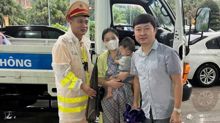 Cảnh sát giao thông giúp nhân dân trong cơn mưa