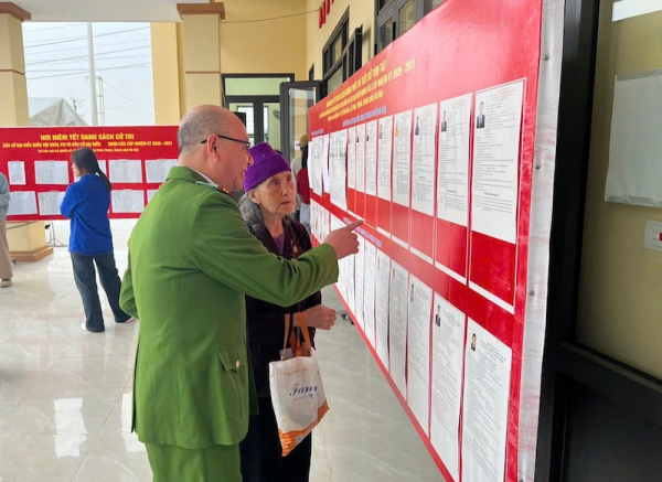 Cán bộ Công an phường Thanh Liệt hỗ trợ cử tri cao tuổi ở khu vực bỏ phiếu.