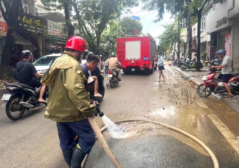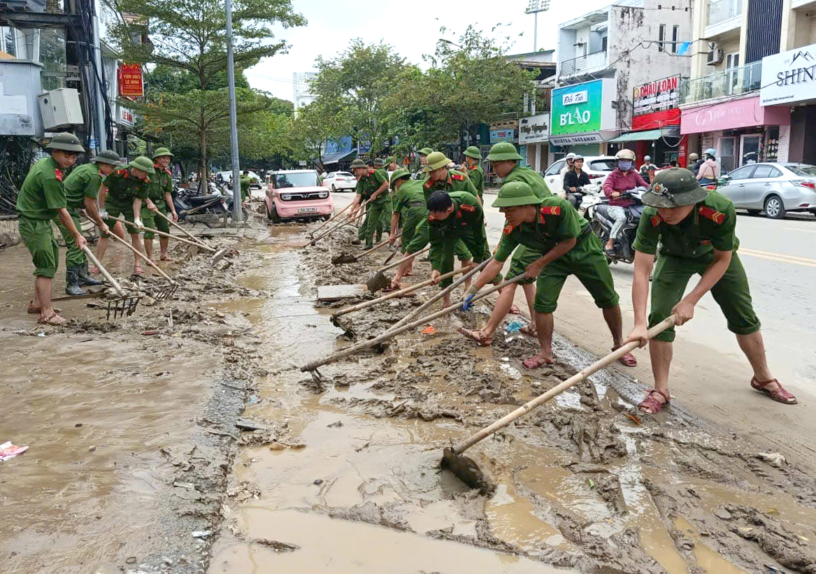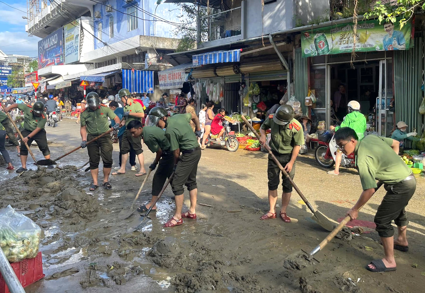 Trên các tuyến phố trung tâm, lực lượng Công an quét dọn bùn đất, khơi thông cống rãnh, làm sạch lòng đường
