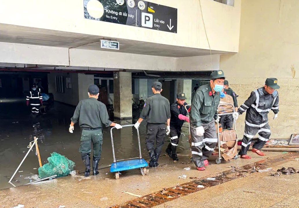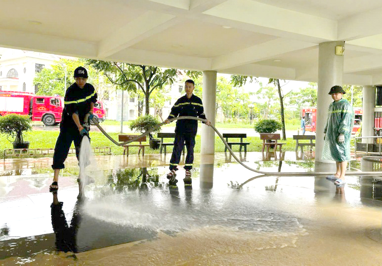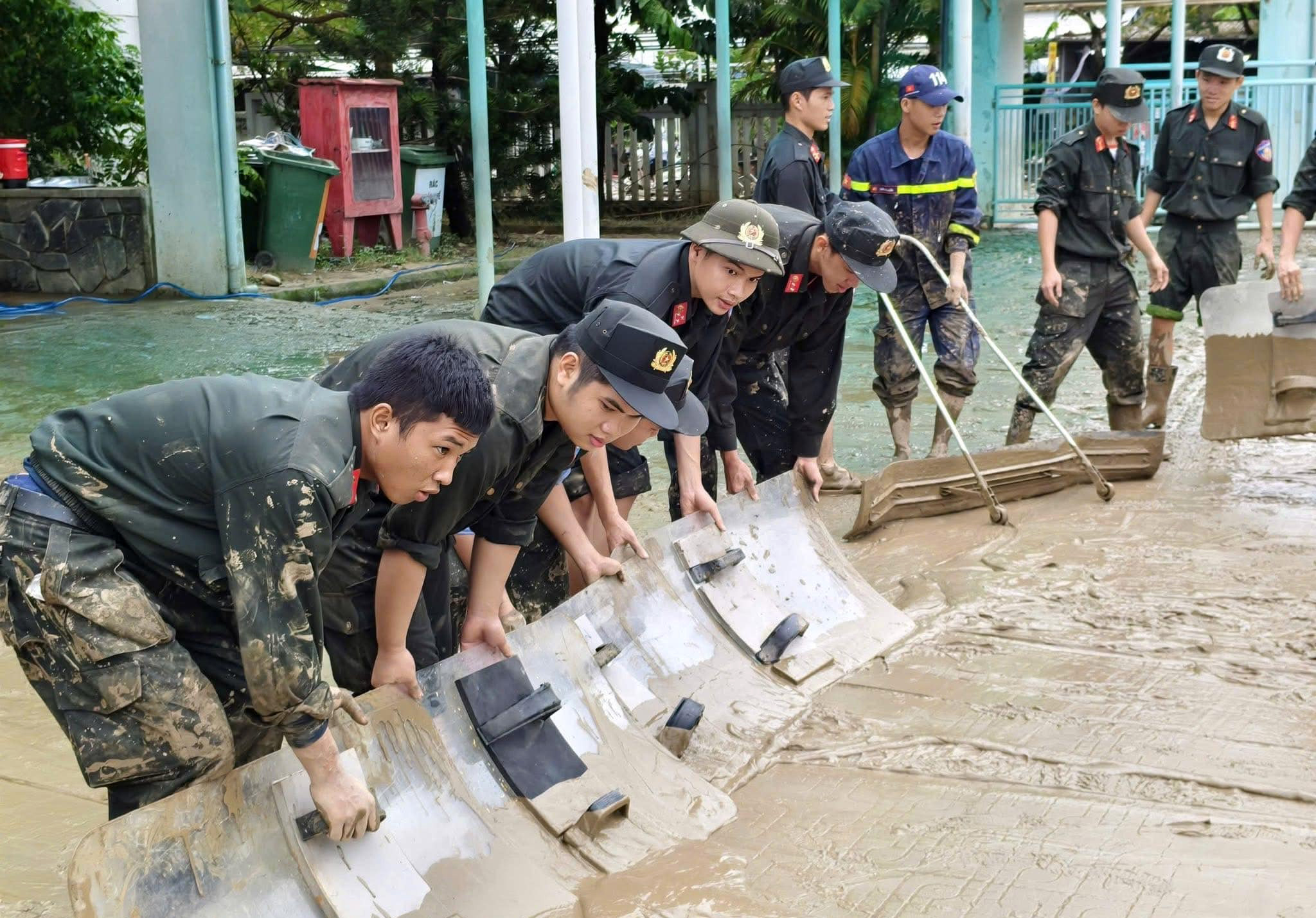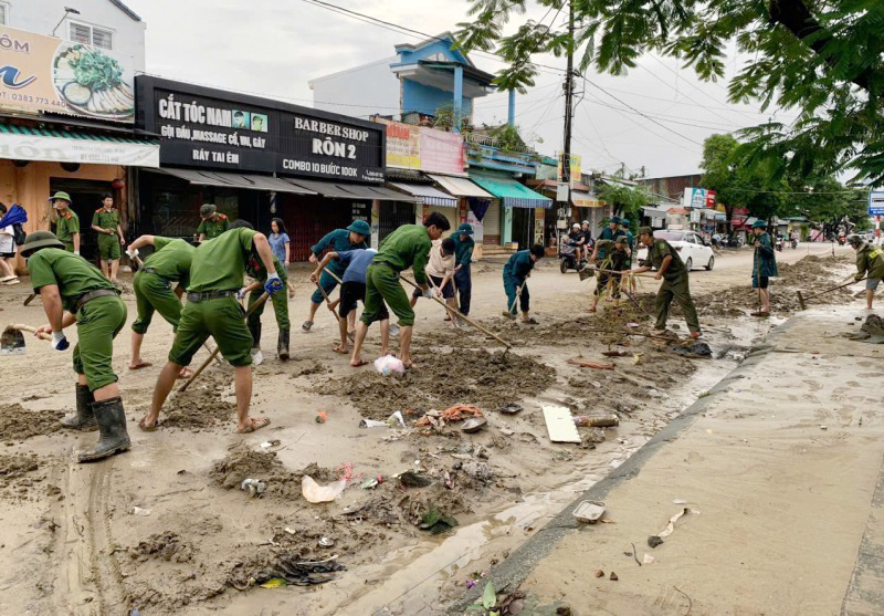 Tham gia khắc phục hậu quả của mưa lũ, dọn dẹp vệ sinh môi trường còn có sự chi viện của Trung đoàn Cảnh sát cơ động Trung Bộ và Công an tỉnh Quảng Trị