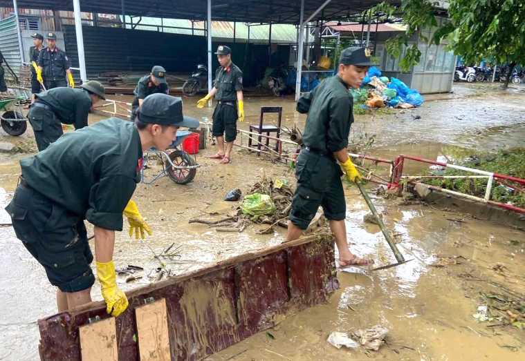 Hàng trăm cán bộ, chiến sĩ có mặt tại các tuyến, khu vực, cùng chính quyền và người dân thu gom rác, nạo vét bùn đất, khơi thông cống rãnh