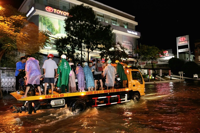 Song song đó, nhân viên của một công ty cũng bố trí người túc trực để sửa chữa xe miễn phí hoặc có đơn vị điều động các xe cứu hộ chuyên dụng đến hỗ trợ. Những chiếc xe này hoạt động liên tục, vận chuyển hàng chục xe máy cùng người dân ra khỏi khu vực ngập sâu, đưa về nơi an toàn.