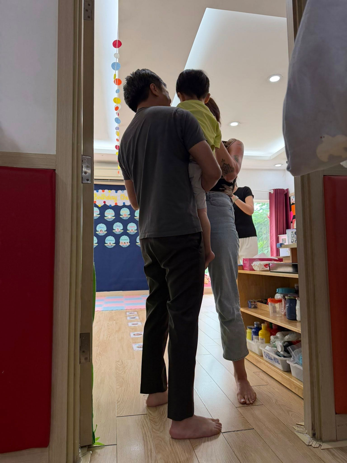 Hình ảnh Cường Đô La đưa con trai út đến lớp học.