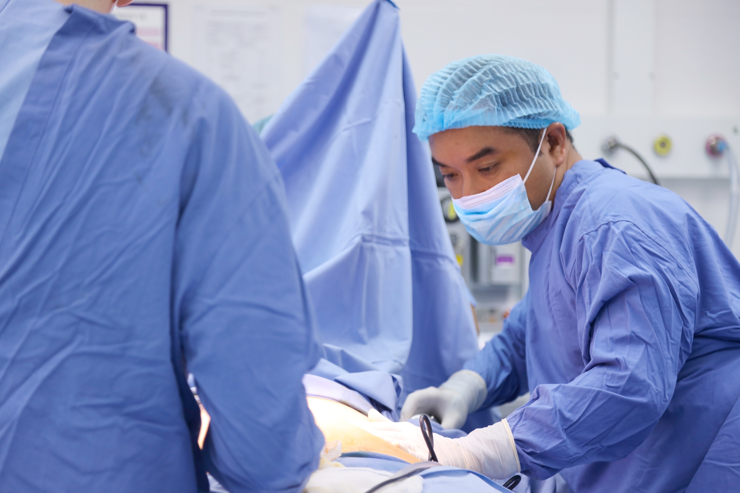Ê-kíp bác sĩ Bệnh viện Da liễu TP.HCM thực hiện một ca hút mỡ bằng máy trợ lực thế hệ mới. Ảnh: BVCC.