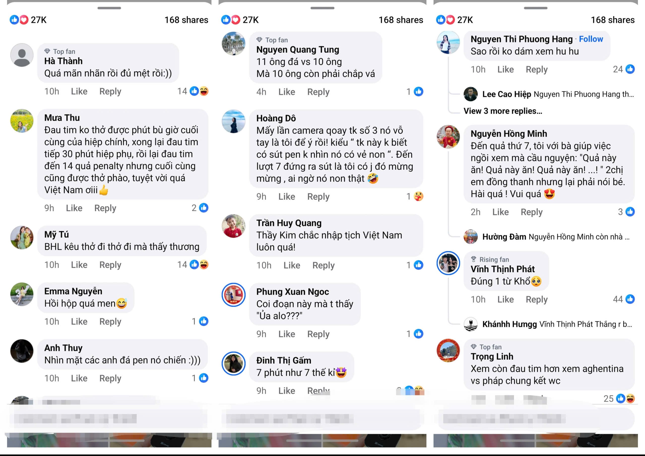 Dưới bài đăng, còn dễ nhận thấy nhìeu bình luận thiên về cảm xúc như của Facebooker Mưa Thu: “Đau tim không thở được ở phút bù giờ cuối cùng của hiệp chính, xong lại đau tim tiếp 30 phút hiệp phụ, rồi lại đau tim đến 14 quả penalty. Nhưng cuối cùng cũng được thở phào. Tuyệt vời quá Việt Nam ơi!”.