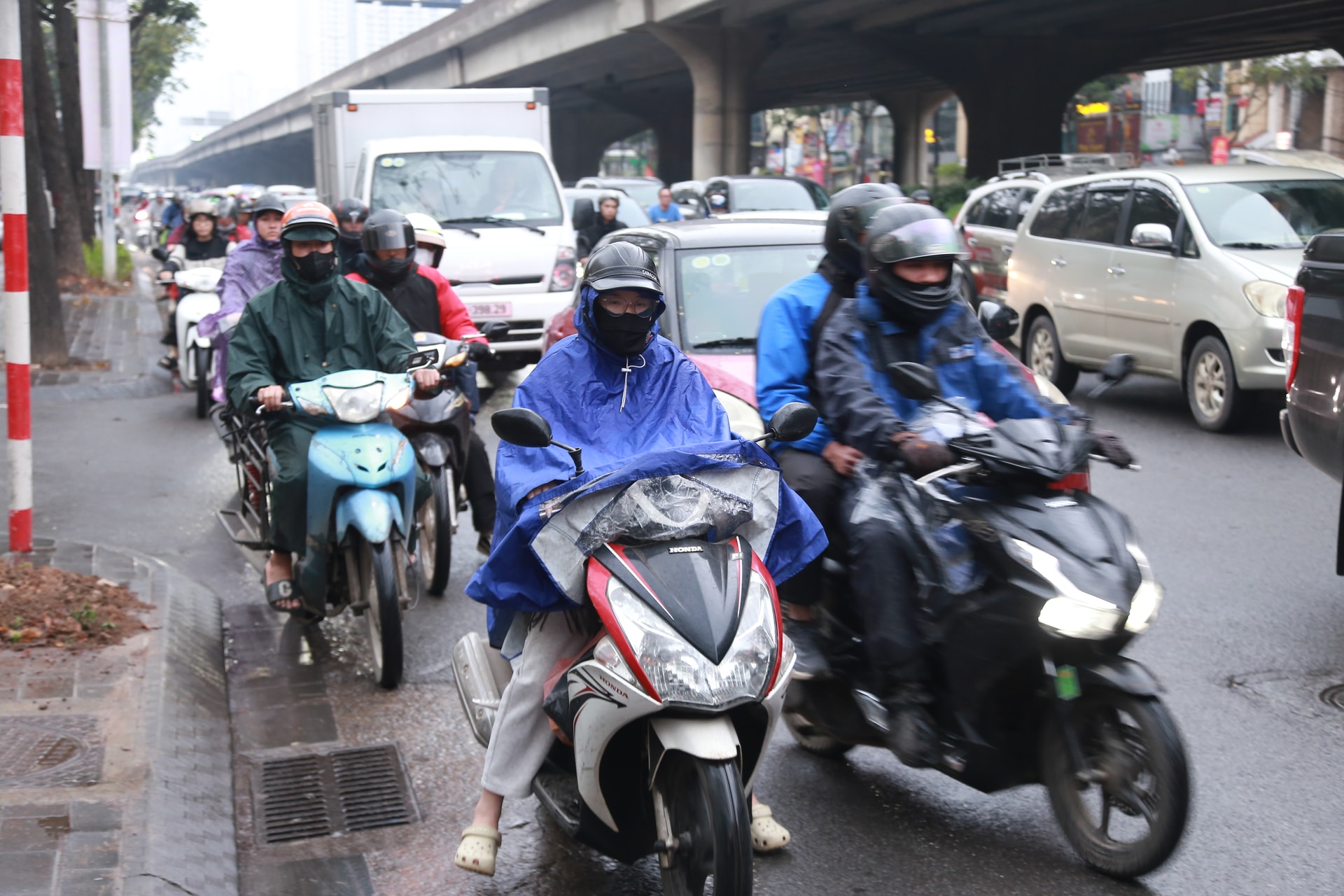 Trong cơn mưa phùn kéo dài, việc đi lại của người dân càng thêm vất vả, nhiều phương tiện phải di chuyển chậm để đảm bảo an toàn.