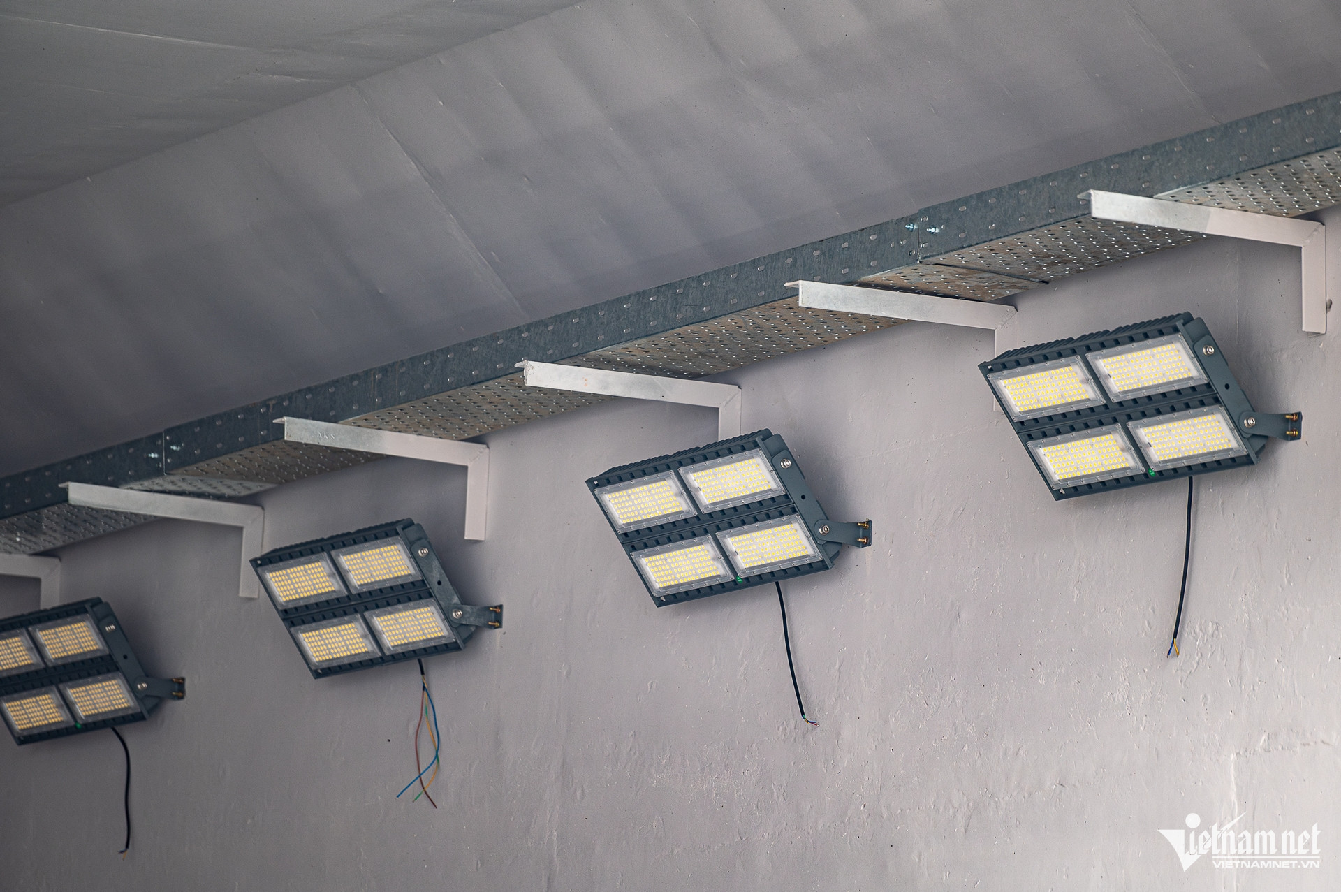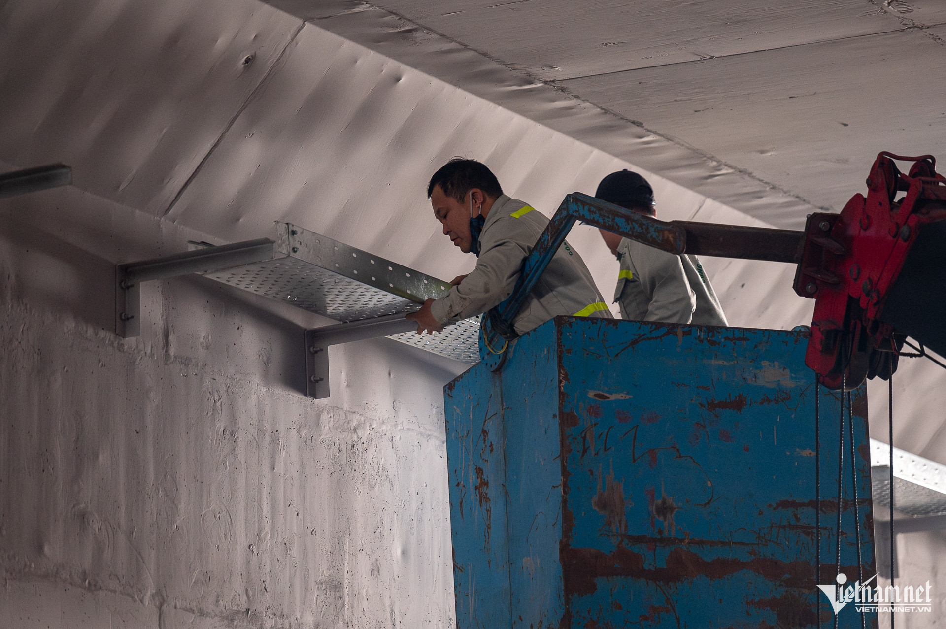 Bên trong đoạn hầm kín, đơn vị thi công đang bị lắp đặt hệ thống thông gió, đèn chiếu sáng và hoàn thiện các hạng mục kỹ thuật còn lại của công trình.
