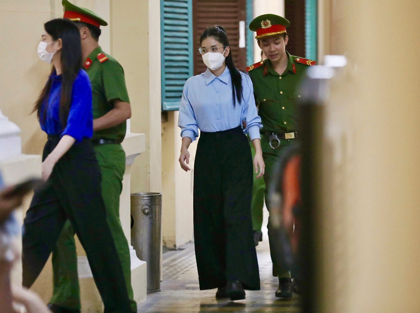 Hình ảnh bị cáo Nguyễn Thúc Thùy Tiên bất ngờ trước sự quan tâm của truyền thông khi được dẫn giải ra khỏi phòng xử án.
