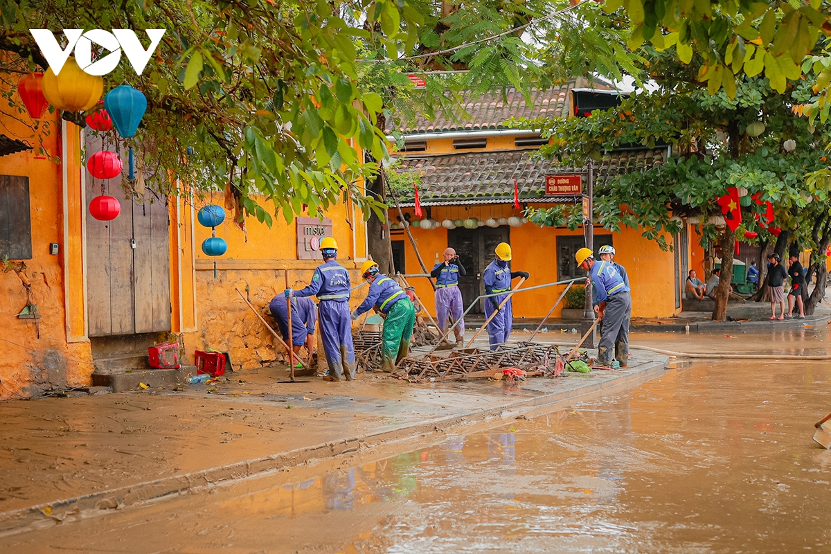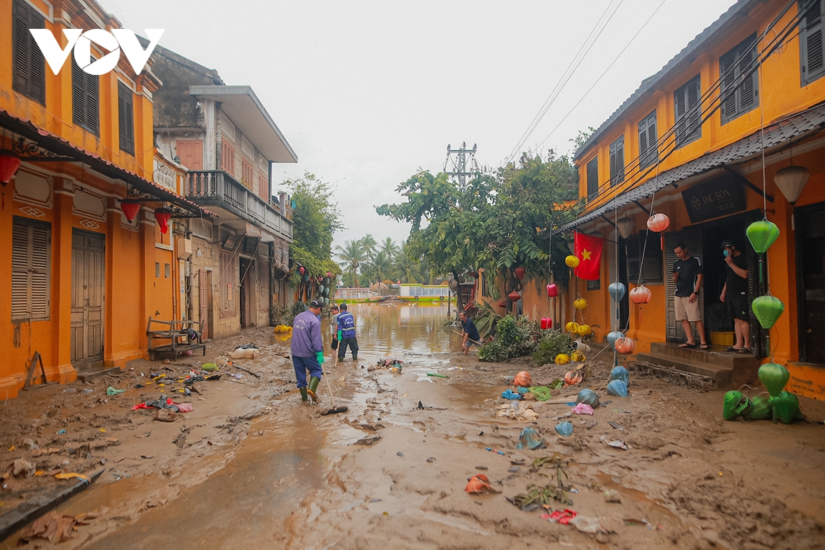 Nhiều nơi thấp ở phố cổ Hội An còn ngập nước, bùn non dày đặc lấp các tuyến phố cổ sau lũ.