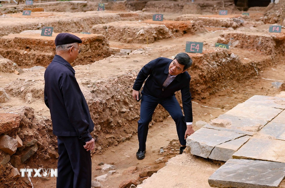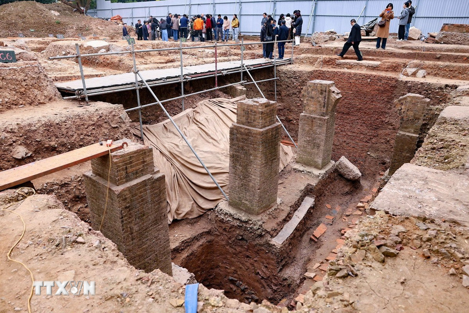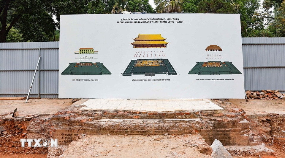 Cuộc khai quật khảo cổ học tại khu vực nền điện Kính Thiên năm 2025 đã đem lại nhiều nhận thức mới với việc phát hiện tầng văn hóa dày 6m, tiến thêm một bước quan trọng việc khẳng định vị trí, cấu trúc của nền điện Kính Thiên (thế kỷ 15-18) chồng xếp lên trên các lớp văn hóa thời Lý, thời Trần (thế kỷ 11-14), thời Tiền Thăng Long (thế kỷ 7-10) minh chứng tầm quan trọng và vị trí thiêng liêng bậc nhất của nền điện Kính Thiên đối với lịch sử-văn hóa Thăng Long nói riêng, Đại Việt nói chung trong tiến trình lịch sử văn hóa hàng nghìn năm của dân tộc. (Ảnh: Thanh Tùng/ TTXVN)