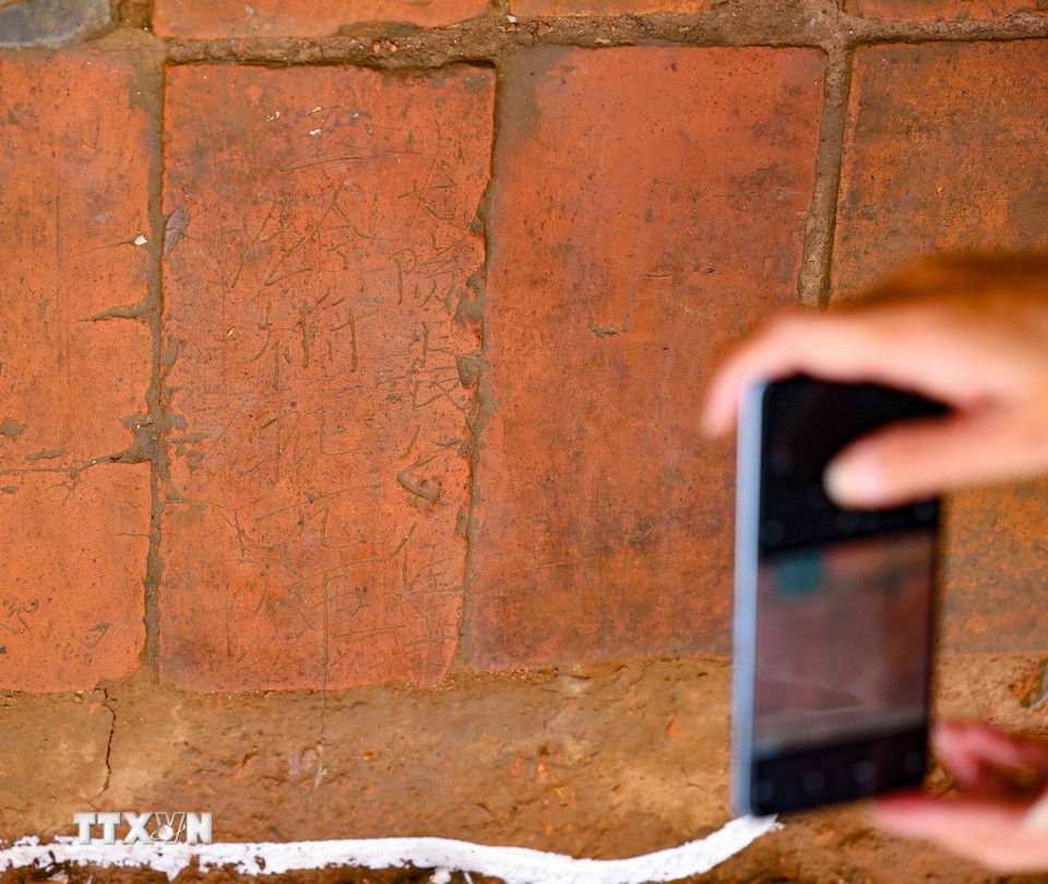 Viên gạch có thông tin về niên đại và đội ngũ sản xuất gạch xây dựng điện Kính Thiên. (Ảnh: Thanh Tùng/ TTXVN)