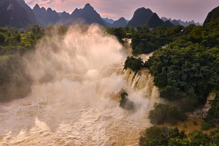 Thay vì dòng nước trong xanh, mềm mại đổ xuống từng tầng như dải lụa, thác Bản Giốc giờ đây là một khối nước khổng lồ cuồn cuộn chảy với màu đục ngầu. Nước lũ từ thượng nguồn dâng cao, tràn ra các bờ đá, khiến dòng chảy trở nên mạnh mẽ hơn bao giờ hết. Nhìn từ trên cao, những cuộn sóng dồn dập cùng hơi nước bốc mờ mịt tạo nên một khung cảnh choáng ngợp nhưng cũng đầy kinh hãi.