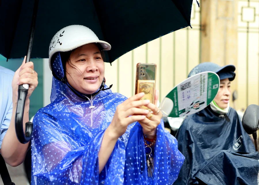 Dù đứng dưới mưa nhưng người mẹ này vẫn không quên chụp lại khoảnh khắc con gái bước ra khỏi phòng thi.