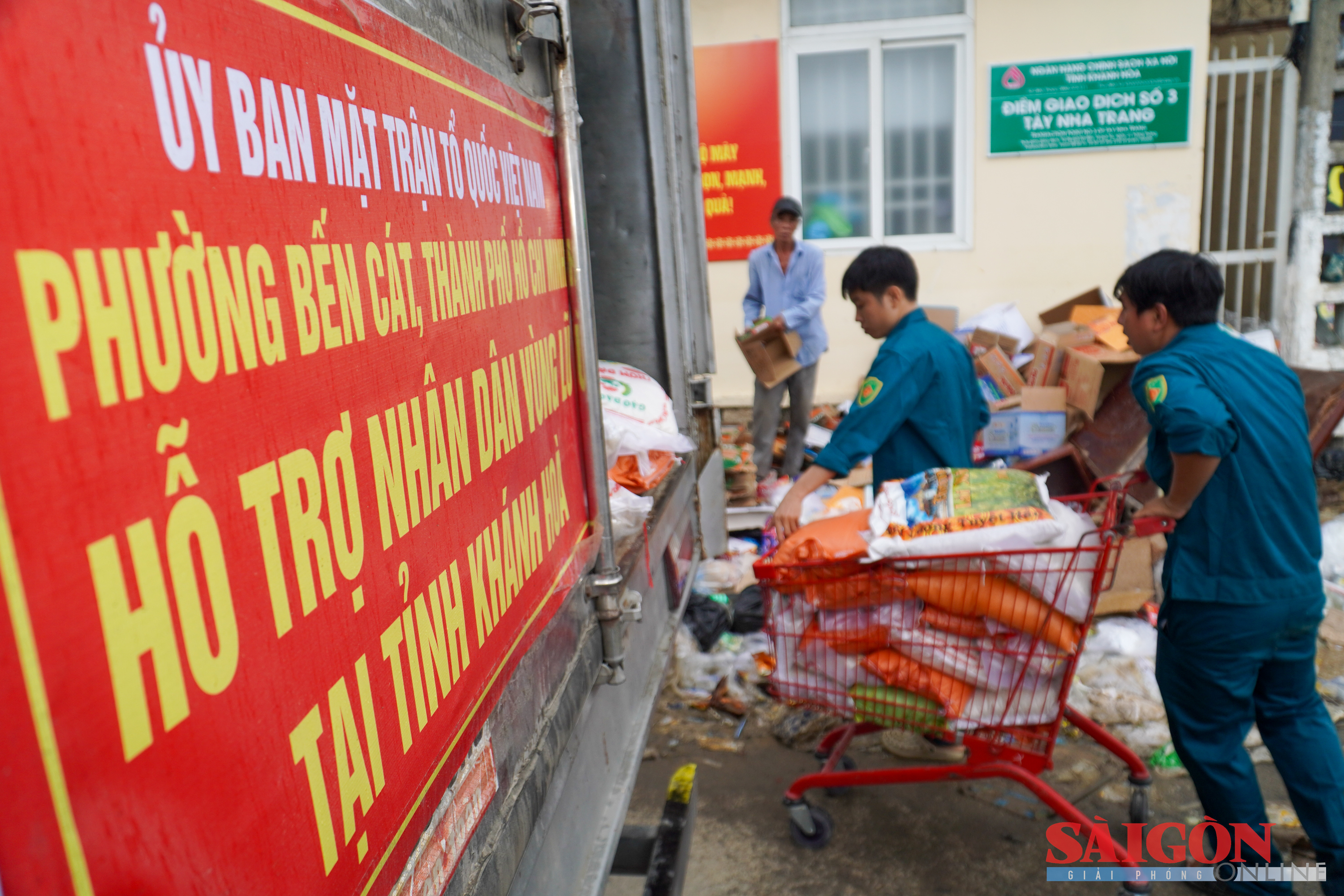 Xe vận chuyển hàng cứu trợ của Ủy ban MTTQ Việt Nam phường Bến Cát, TPHCM tập kết tại điểm phường Tây Nha Trang, tỉnh Khánh Hòa