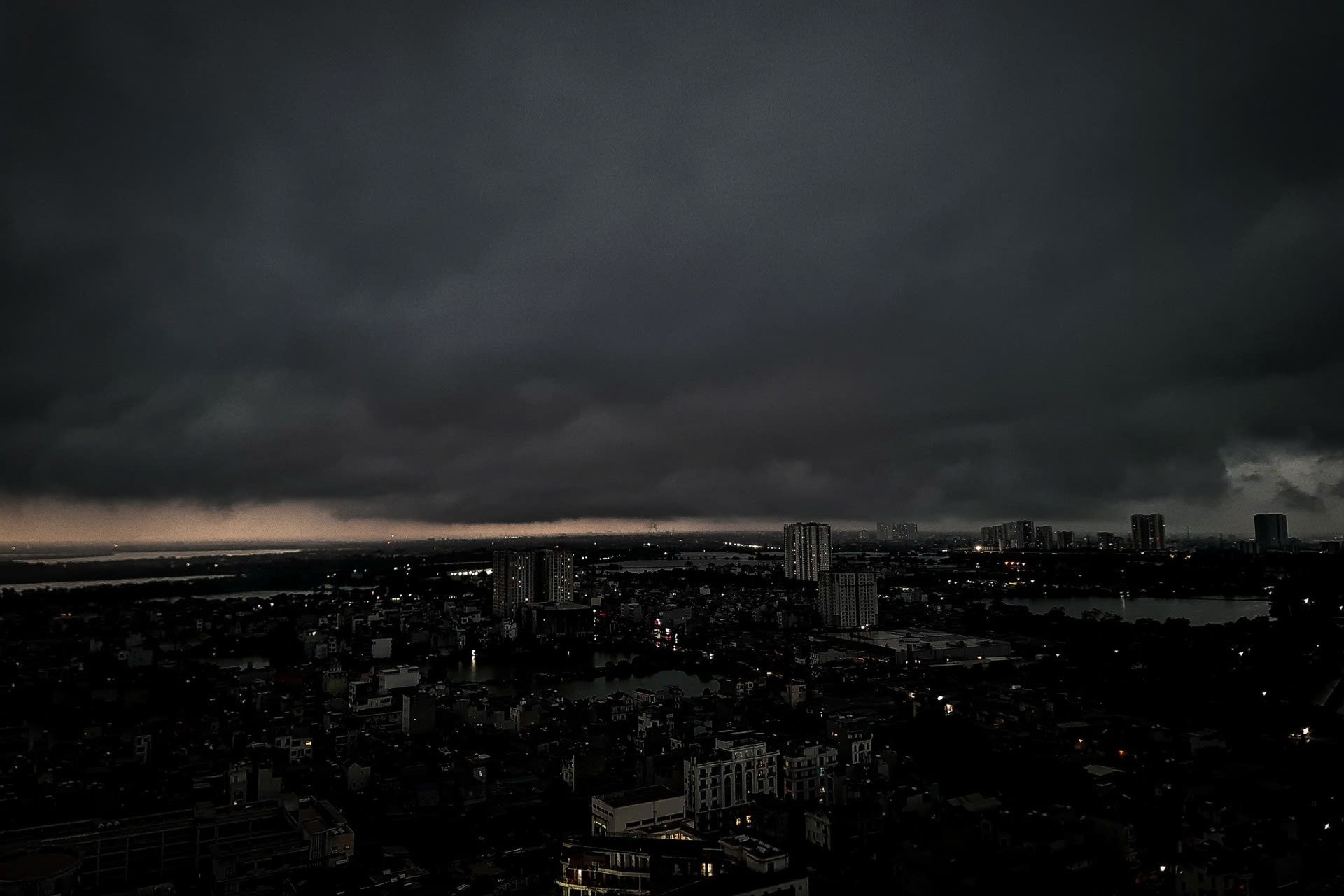 Sáng 7/9, tài khoản Phan Hồng Sơn đăng tải hình ảnh bầu trời Hà Nội tối đen. Theo anh Sơn, bức ảnh được chụp từ ban công tầng 28, tòa nhà CT1 - Gelexia - 885 Tam Trinh, hướng ra hồ Công viên Yên Sở vào lúc 6h20.