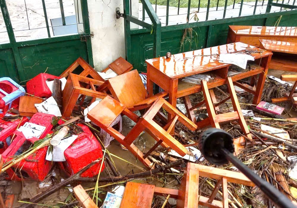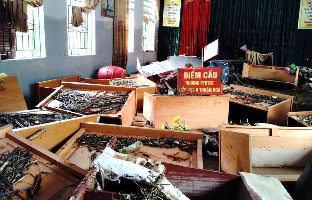 Một tuần sau khi nước rút, khuôn viên trường Trường Phổ thông Dân tộc Bán trú Tiểu học B Thuận Hòa vẫn ngổn ngang, những vệt bùn đất in ngang tường cao tới hơn 3 mét. Bàn ghế, tủ, ti vi, máy tính, chăn màn học sinh, tất cả đều hỏng nặng.