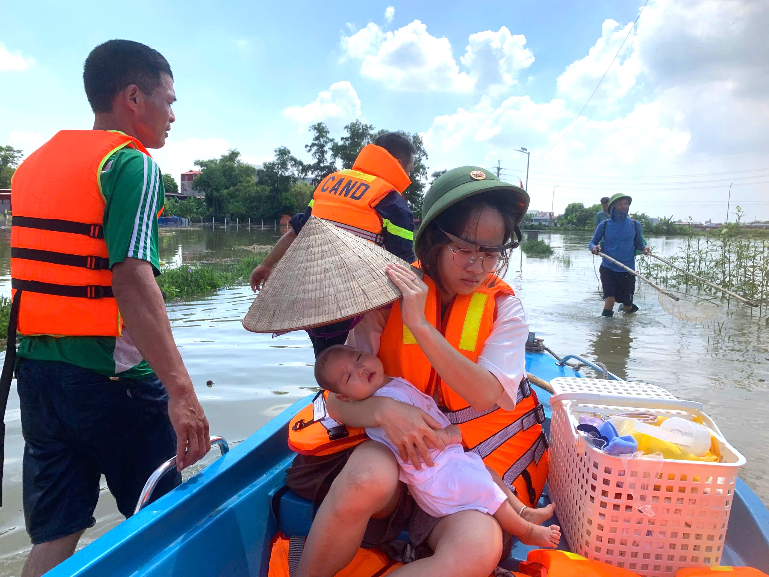 Người lính cứu hộ sơ tán đứa bé đang ẵm ngửa