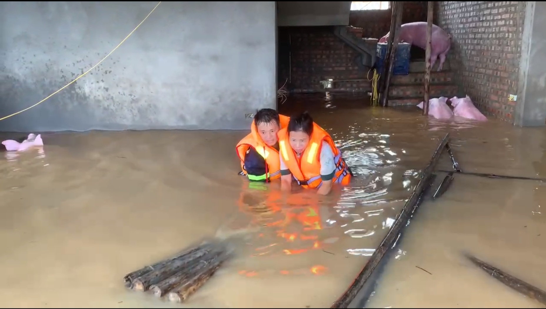 Hình ảnh những người dân bì bõm lội lũ, bỏ lại sau lưng đàn lợn..