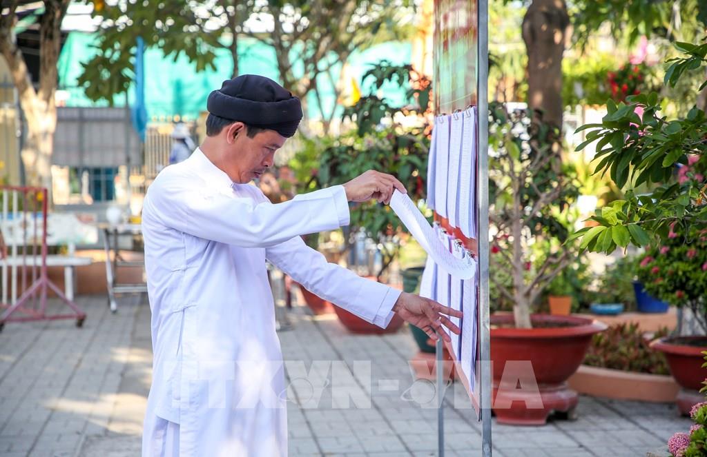 Cử tri đồng bào theo tôn giáo Cao Đài tại phường Long Hoa xem kỹ thông tin ứng cử viên trước khi bỏ phiếu. Ảnh: Giang Phương - TTXVN