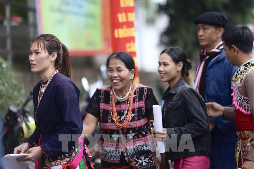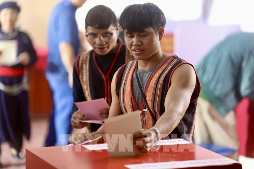 Cử tri là đồng bào các dân tộc đang sinh sống và sinh hoạt tại Làng Văn hóa - Du lịch các dân tộc Việt Nam có mặt tại khu vực bỏ phiếu số 19, thôn Tân Phúc để thực hiện quyền và nghĩa vụ công dân. Ảnh: Phương Anh - TTXVN
