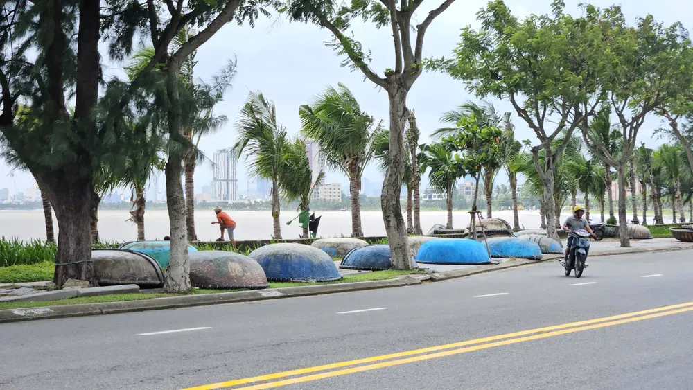 Dọc theo đường ven biển Hoàng Sa – Võ Nguyên Giáp, hàng trăm thuyền thúng của ngư dân được kéo lên bờ, đưa hẳn qua phía tây đường, cột chặt vào các gốc cây để giữ an toàn trước gió lớn.