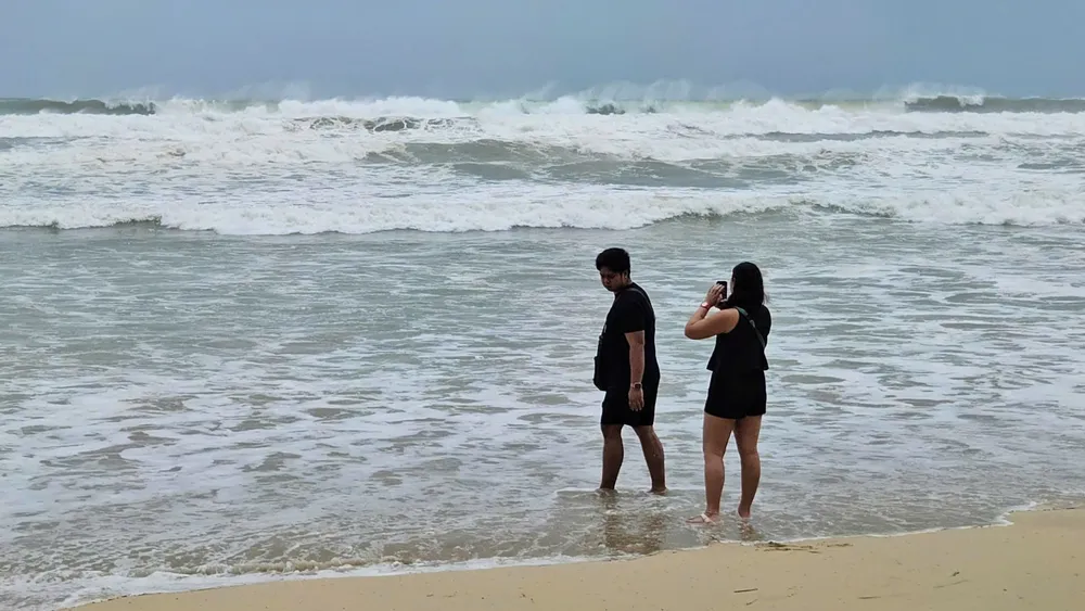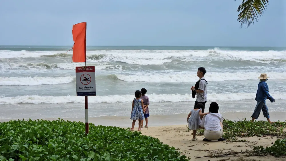 Nhiều du khách nước ngoài ra biển check-in dù sóng lớn. Ảnh: TẤN VIỆT