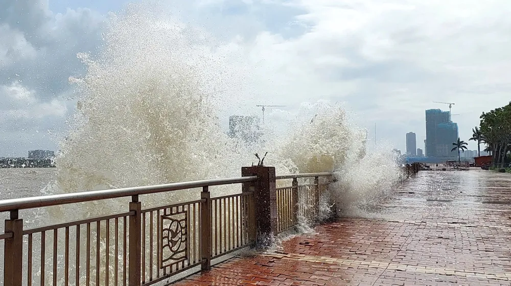 Ngày 21-10, do ảnh hưởng bão số 12, tại Đà Nẵng có mưa từng đợt nhỏ xen nắng nhẹ; tuy nhiên gió bắt đầu lớn dần lên. Ven biển phía đông TP Đà Nẵng, nước biển dâng cao, vào sát mép bờ kè đường Hoàng Sa.