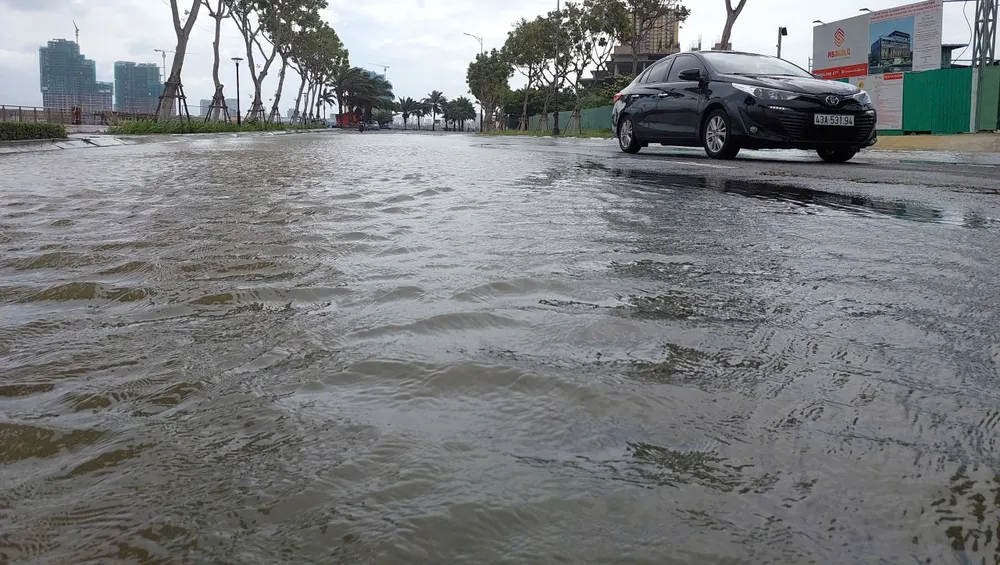 Nước biển dâng vào đến mép bờ kè đường Hoàng Sa. Ảnh: TẤN VIỆT