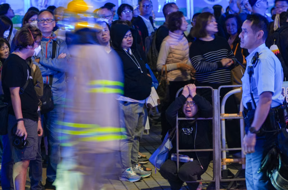Cư dân tuyệt vọng tên là Wong đã gục ngã và khóc nức nở bên ngoài tòa tháp đang cháy. Anh nói vợ anh bị mắc kẹt bên trong tòa nhà xảy ra hỏa hoạn. (Ảnh: Reuters)