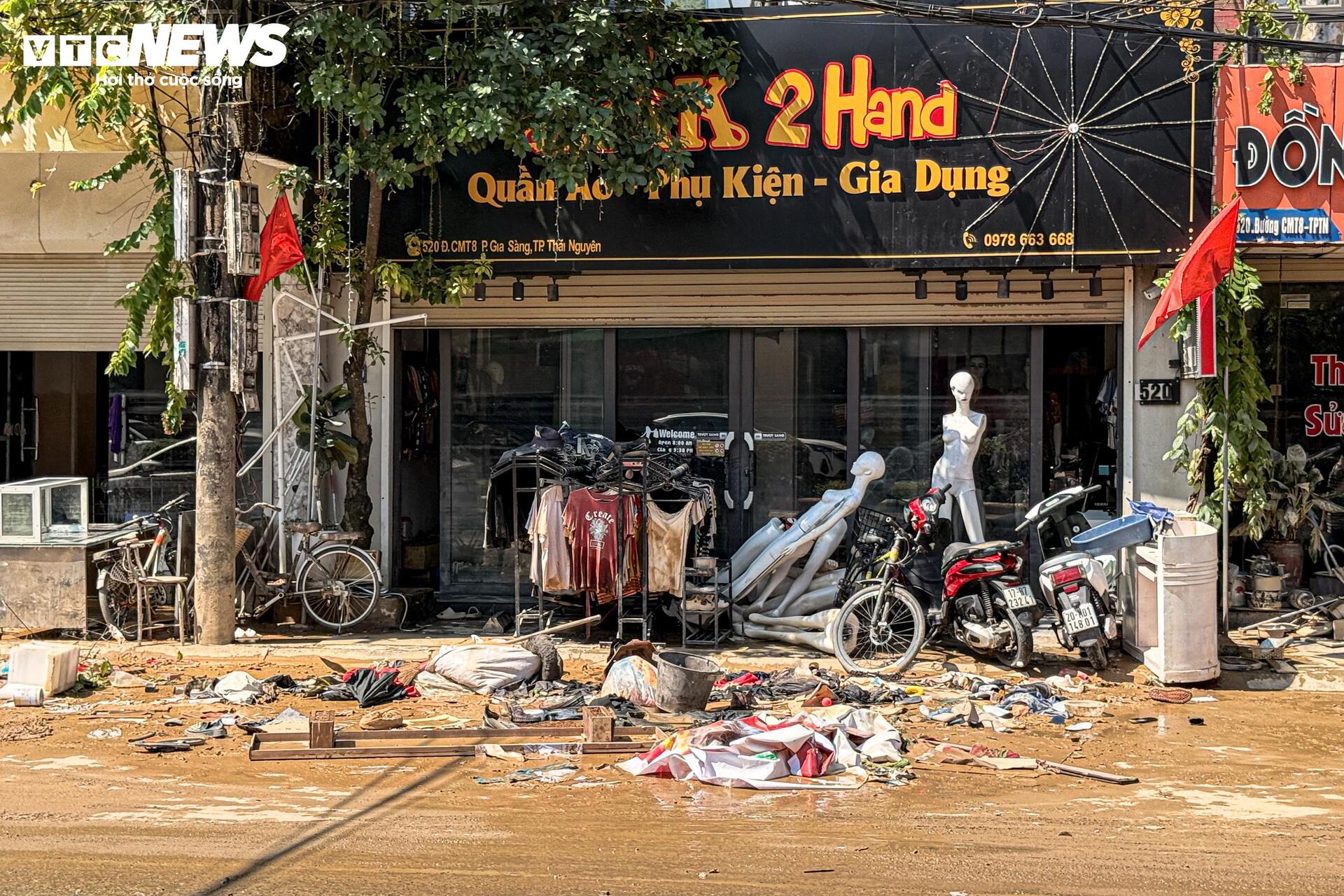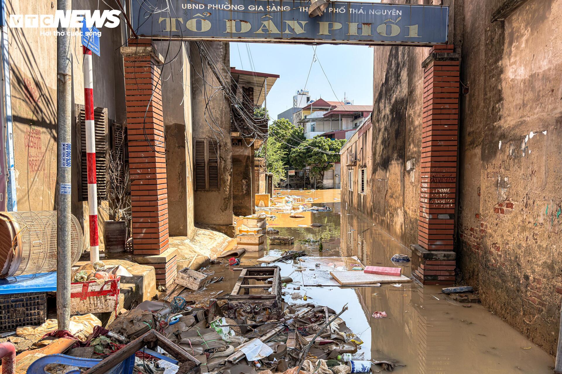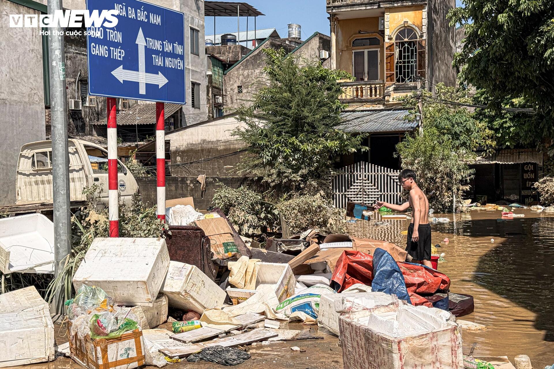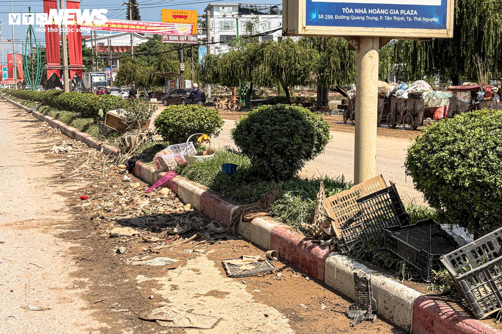 Khu vực trung tâm tỉnh Thái Nguyên vốn sầm uất nay hiện lên trong cảnh tượng ngổn ngang, bùn đất phủ kín đường, rác thải chất thành đống, mùi hôi bốc lên nồng nặc dưới cái nắng gay gắt.