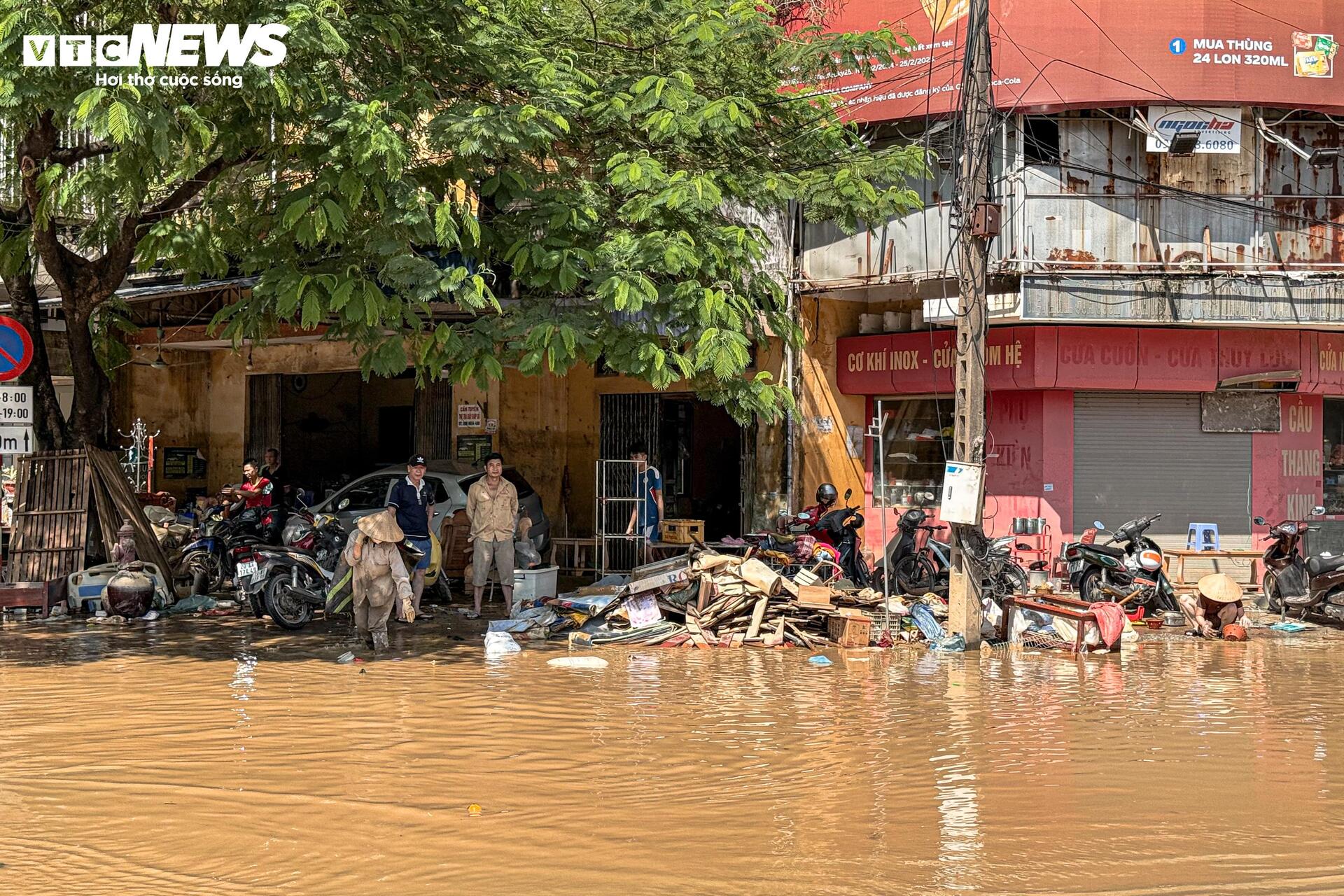 Lực lượng môi trường đô thị, đoàn viên thanh niên và dân phòng đang được huy động để thu gom, vận chuyển, làm sạch các tuyến đường chính. Một số tuyến phố vẫn phải dùng máy bơm hút nước, khơi thông hệ thống thoát nước bị tắc nghẽn.
