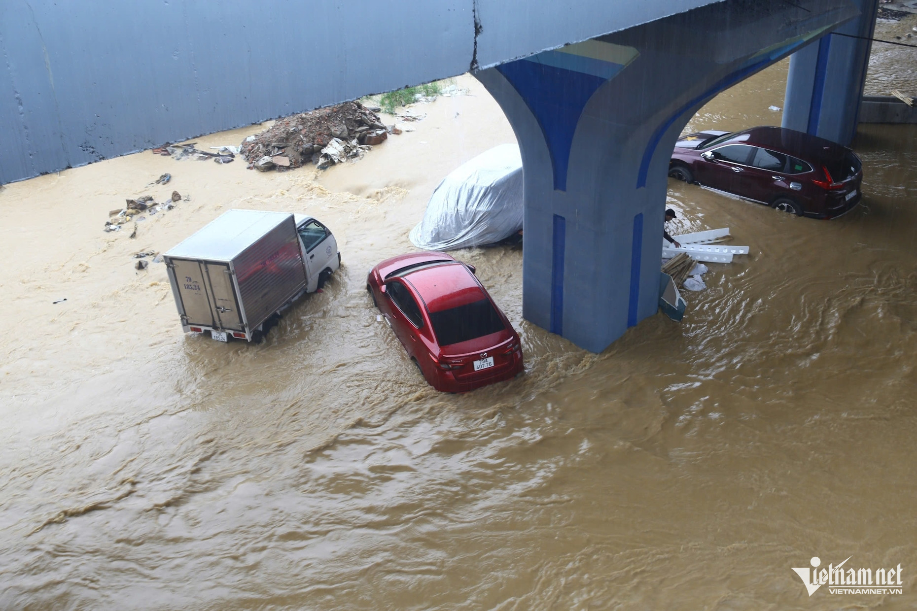 Khu vực nút giao Ngọc Hội, nhiều ô tô bị cuốn trôi hoặc mắc kẹt dưới gầm cầu.