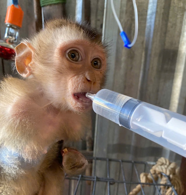 Một chú khỉ con được bổ sung dinh dưỡng qua ống bơm để nhanh chóng phát triển và sớm trở về tự nhiên.