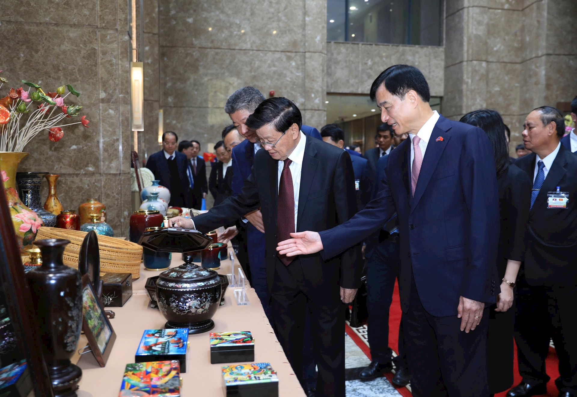 Tổng Bí thư, Chủ tịch nước Lào Thongloun Sisoulith và Bí thư Thành ủy Hà Nội Nguyễn Duy Ngọc cùng các đại biểu tham quan không gian trưng bày các sản phẩm thủ công mỹ nghệ làng nghề truyền thống của Hà Nội. Ảnh: Quang Thái