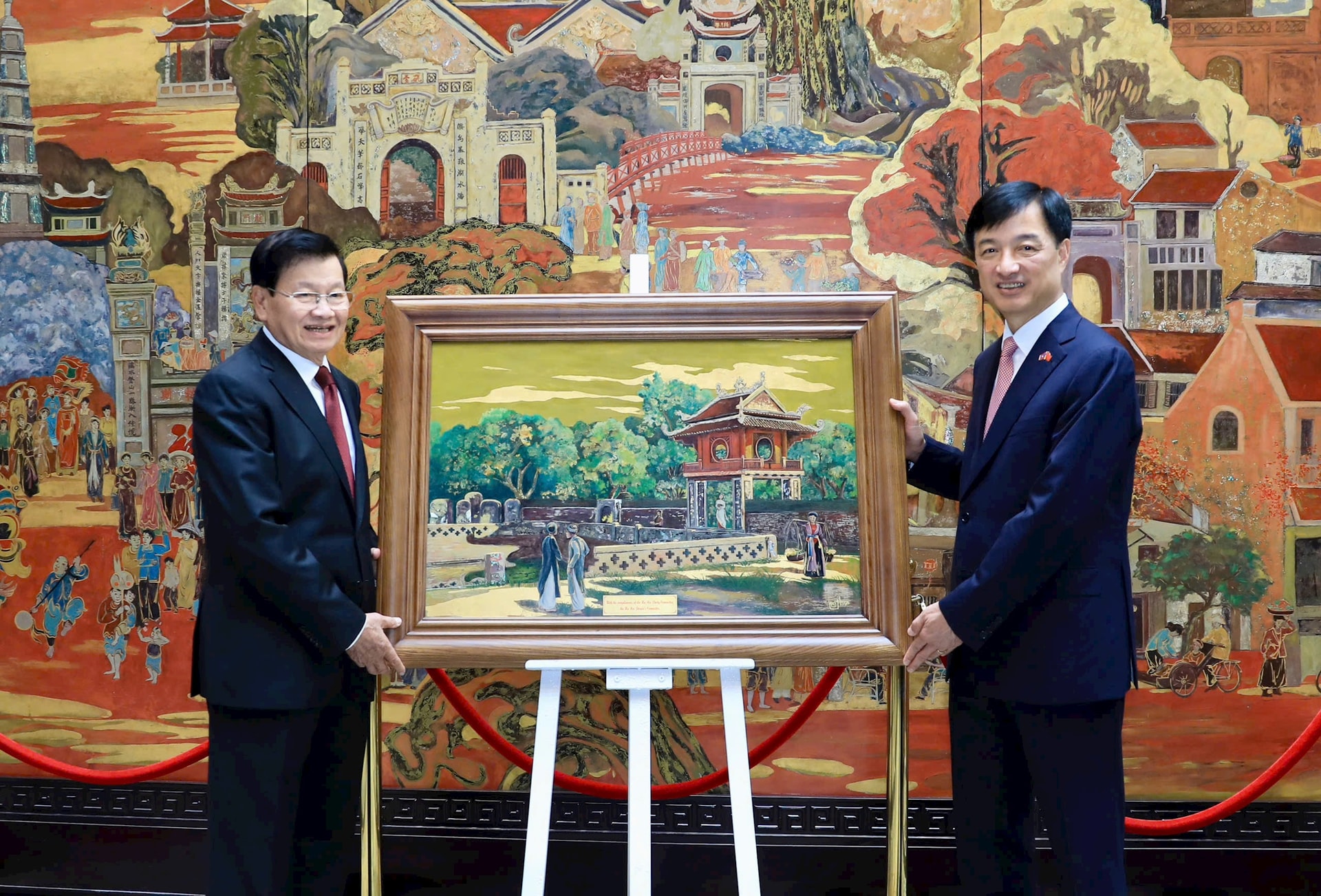 Bí thư Thành ủy Hà Nội Nguyễn Duy Ngọc trao quà lưu niệm của Thành ủy Hà Nội tặng Tổng Bí thư, Chủ tịch nước Lào Thongloun Sisoulith. Ảnh: Quang Thái