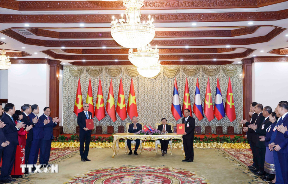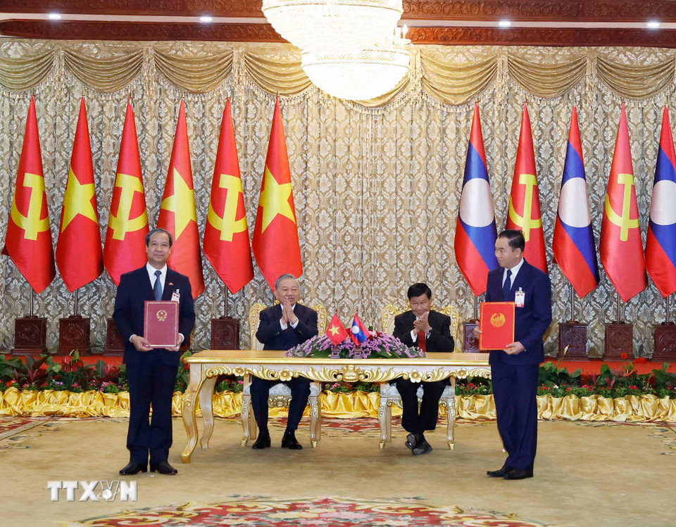 Tổng Bí thư Tô Lâm và Tổng Bí thư, Chủ tịch nước Lào Thongloun Sisoulith chứng kiến Lễ trao các văn kiện hợp tác Chương trình hợp tác năm 2026 giữa Bộ Tư pháp Việt Nam và Bộ Tư pháp Lào. (Ảnh: Thống Nhất/TTXVN)