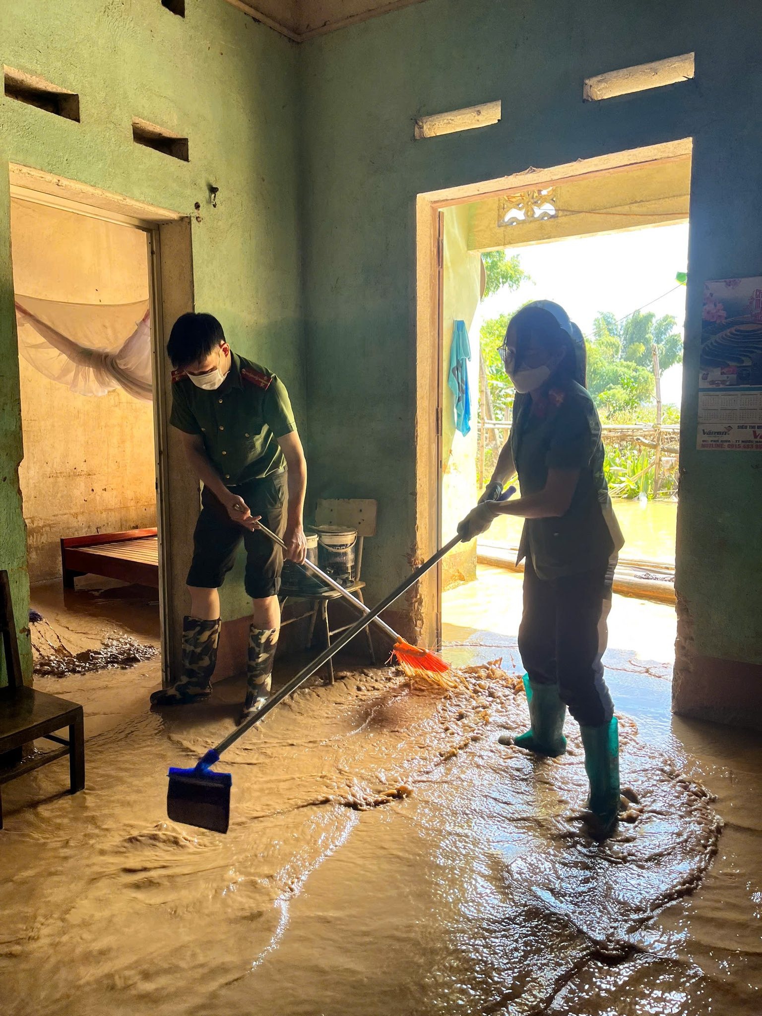 Công an xã Nam Tuấn phụ giúp người dân dọn dẹp đồ đạc, nhà cửa sau khi nước lũ rút. Ảnh: Công an xã Nam Tuấn.