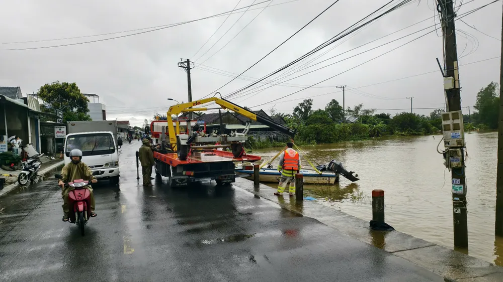 Không chỉ có các đoàn cứu trợ, lực lượng chức năng cũng điều nhiều phương tiện, cán bộ, chiến sĩ mang theo ca nô đến triển khai hỗ trợ người dân. Đồng thời, chở theo nhu yếu phẩm cho người dân trong vùng lũ.