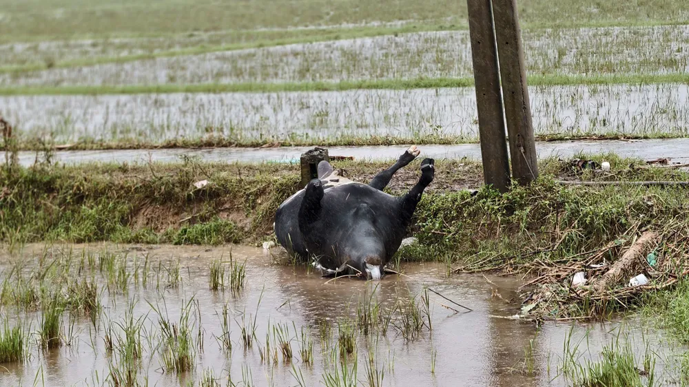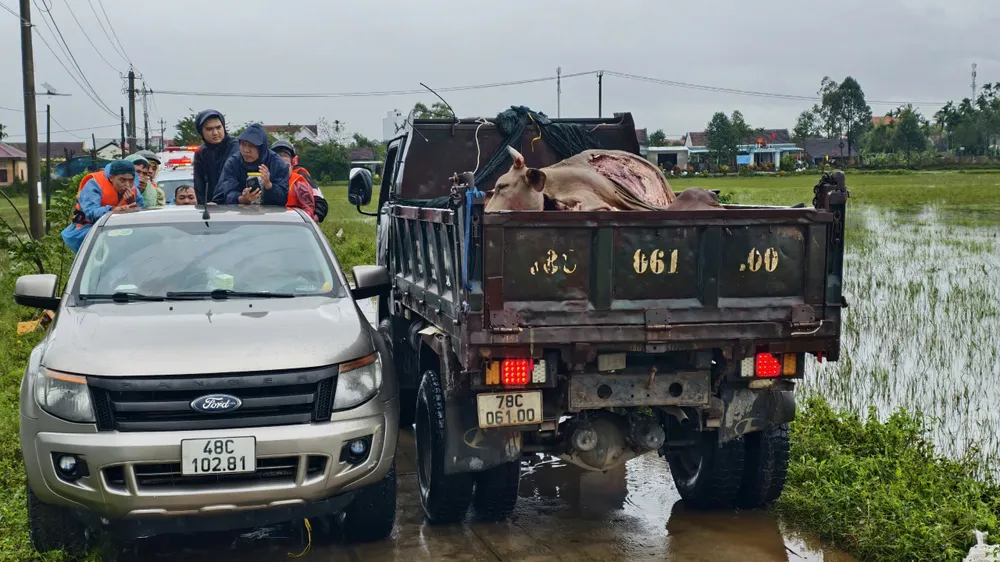 Nhiều gia súc, gia cầm bị chết trong nước lũ, nằm lại trên các cánh đồng.